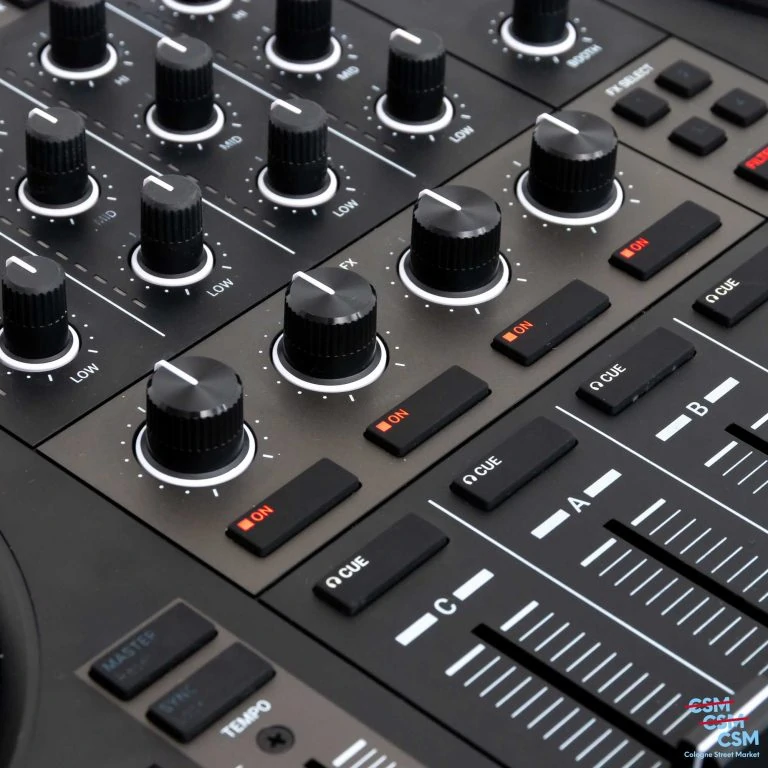 - Ausgänge: 1x Main (Cinch), 1x Main (XLR), Booth (6,3 mm Klinke), 1x Kopfhörer (3,5 mm Klinke), 1x Kopfhörer (6,3 mm Klinke)