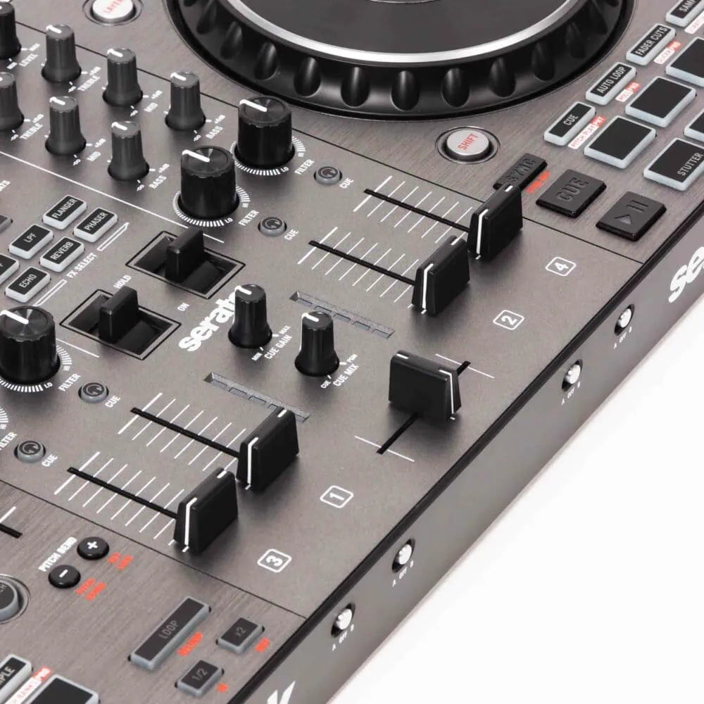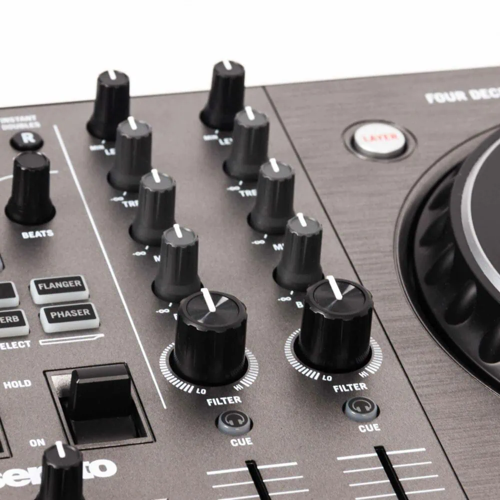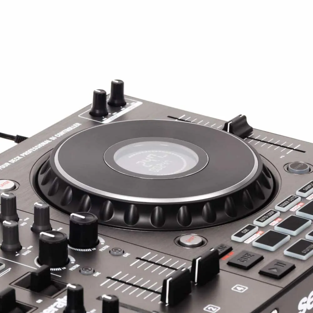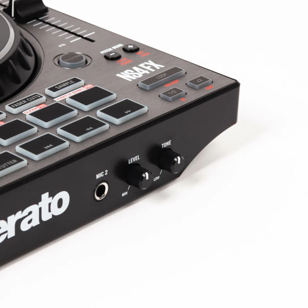 Der Numark NS4FX ist ein preiswerter Controller mit vier Kanälen und Serato DJ Unterstützung. Die beiden Jogwheels geben Zugriff auf alle vier Software-Decks und die vier übersichtlich angeordneten Fader sorgen für sauberes Mixen. Mit den 16 Performance-Pads kannst du weitere Funktionen wie Loops ansteuern. Dank der professionellen Anschlüsse wie dem XLR-Main Out und dem zusätzlichen Booth-Out kann der NS4FX ohne Probleme im Club oder auf Open-Air-Partys eingesetzt werden. Besonders hervorzuheben ist noch die Streamingmöglichkeit von Serato DJ: mit Beatport, Beatsource, Soundcloud Pro und Tidal kann fast jeder Musikwunsch erfüllt werden.