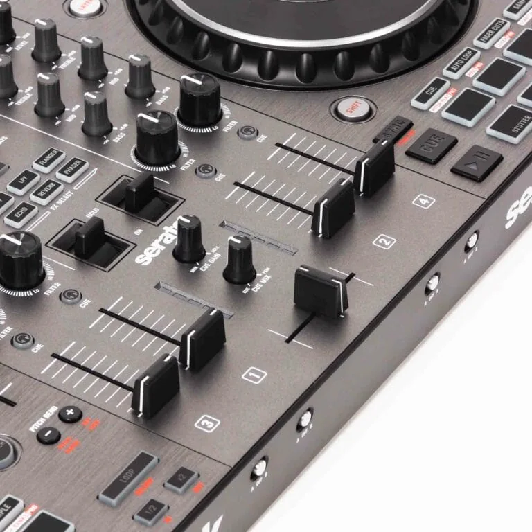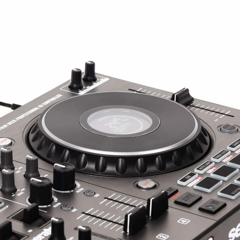 - 8 Performance Pads pro Deck (Pad Modes: Cue, Pitch Play, Auto Loop, Roll, Fader Cuts, Slicer, Sampler, Scratch Banks)