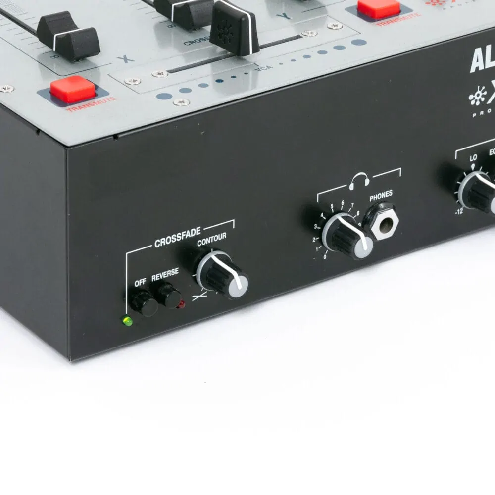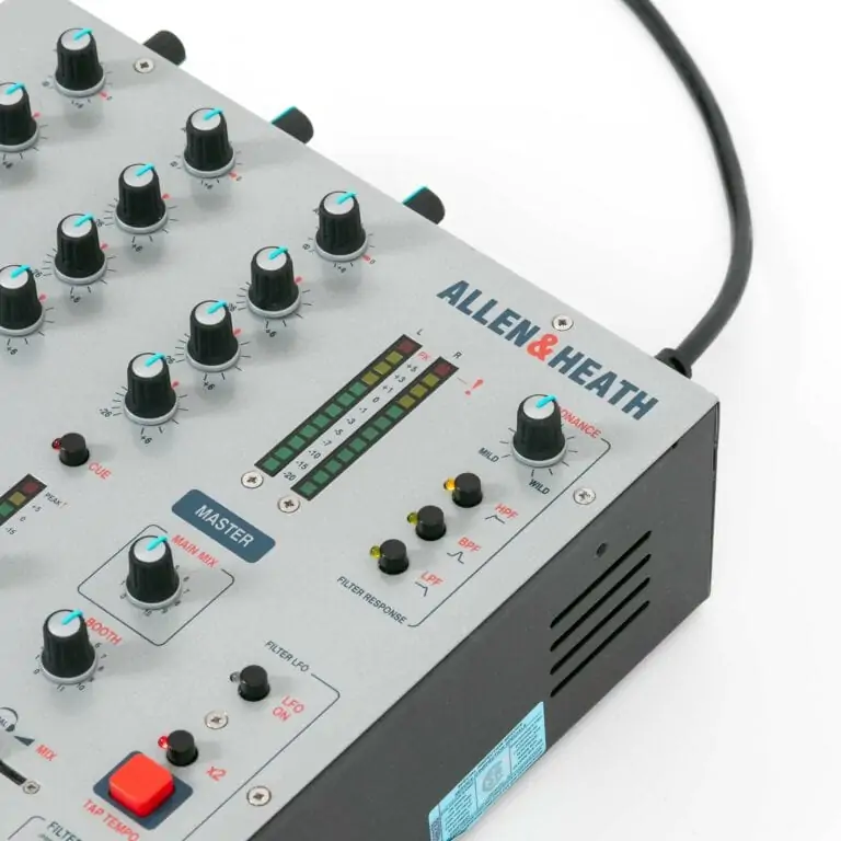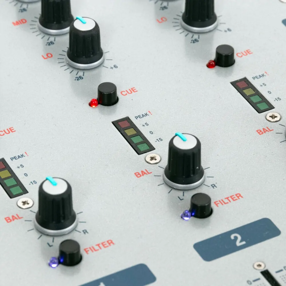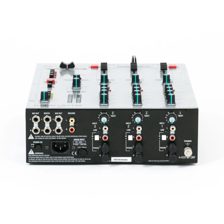 - Ausgänge: 1x Mix Out (Stereo 6,3 mm Klinke), 1x Booth (Stereo 6,3 mm Klinke), 1x Aux Out (Stereo 6,3 mm Klinke), 1x Record (Stereo Cinch), 1x Phones (6,3 mm Klinke)