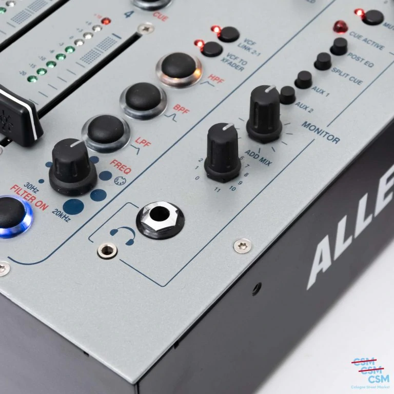 - Ausgänge: 1x Master (XLR), 1x Kopfhörer (6,35 mm Klinke), 1x Kopfhörer (3,5 mm Klinke), 1x Booth (6,35 mm Klinke), 1x Mix2 (6,35 mm Klinke), 1x Record (RCA), 2x Send (RCA)