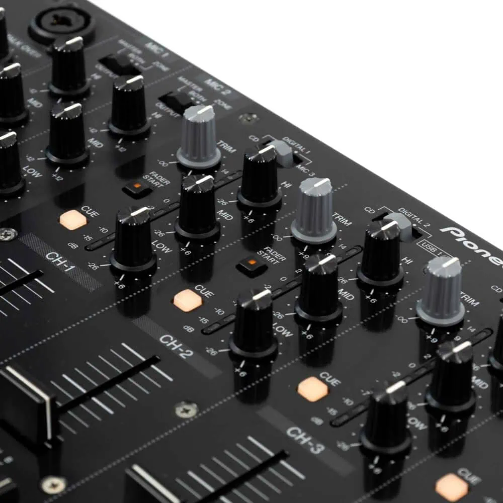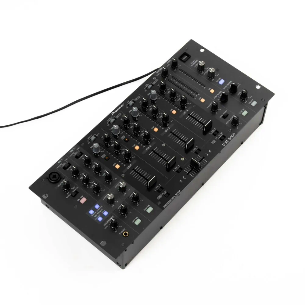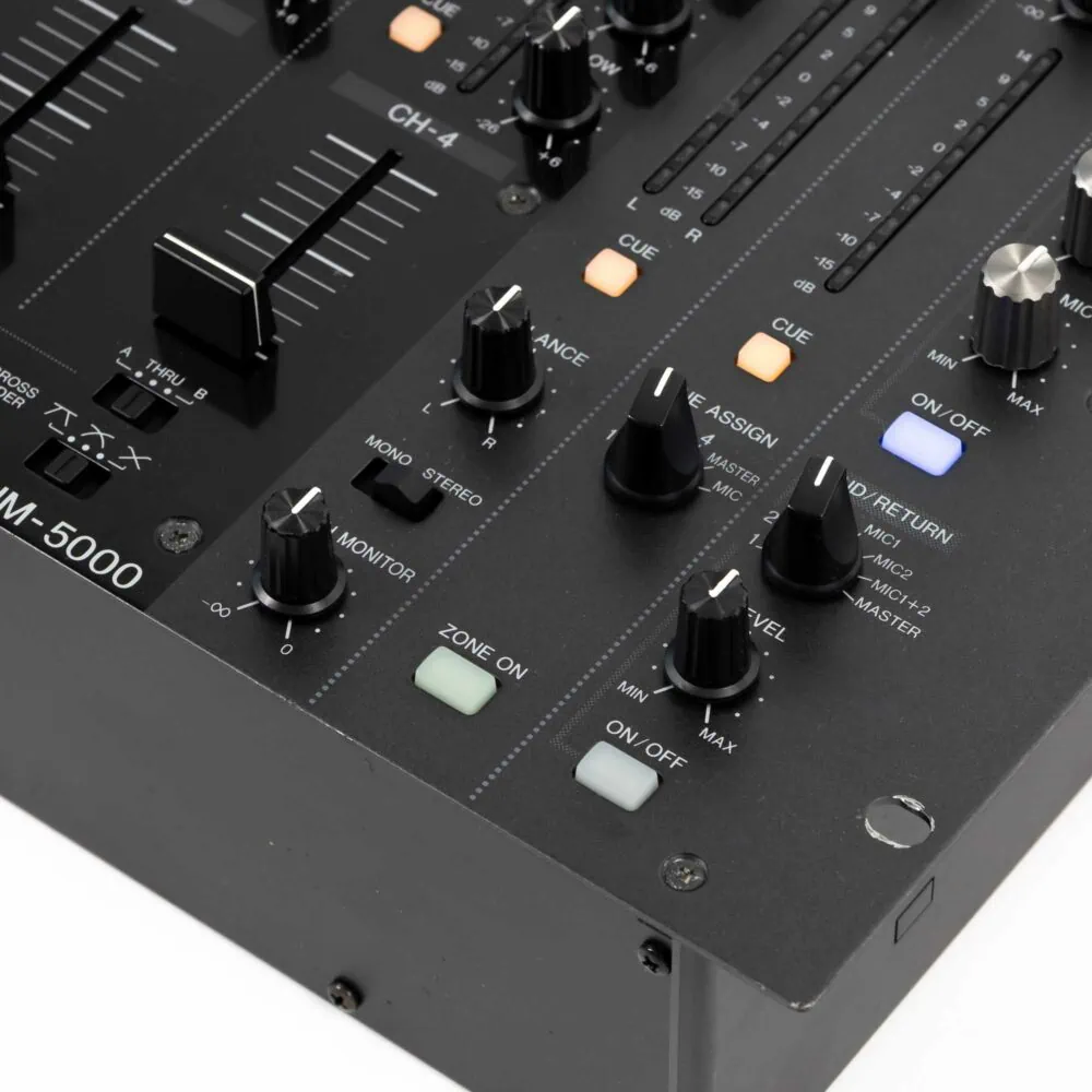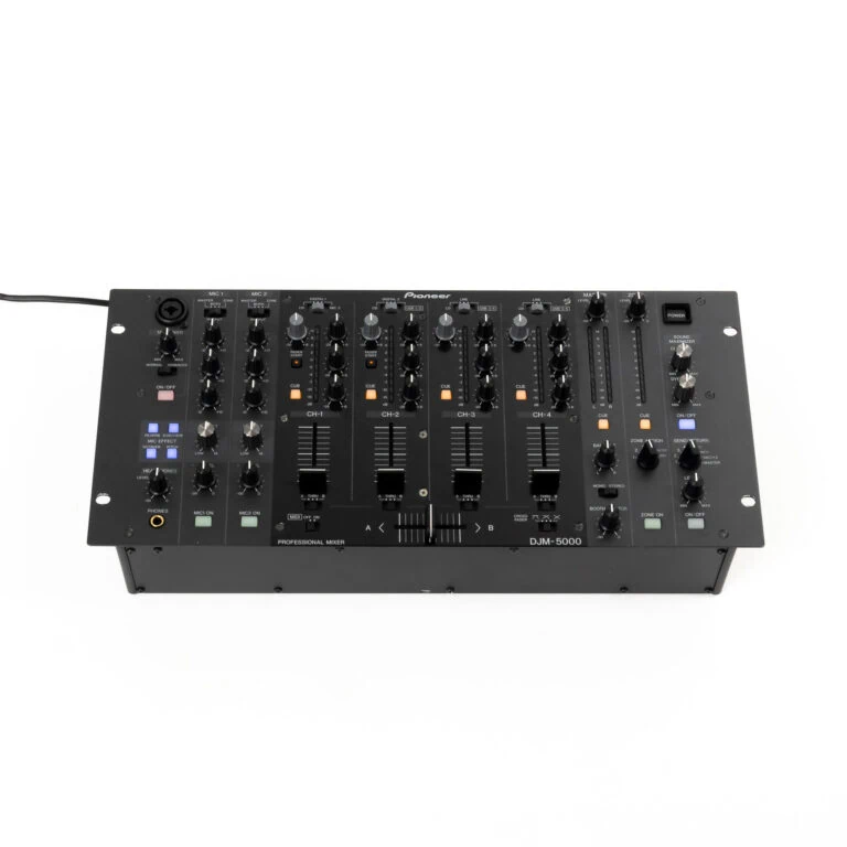 Der Pioneer DJ DJM 5000 ist ein 4-Kanal-Mixer für 19-Zoll-Racks und bietet 96-kHz/24-Bit-Digitalaudio in Studioqualität. Dank der dreiwege USB-Audio-Schnittstelle hast du einen Direkt-Eingang für deinen PC. Der Mixer verfügt über einen Sound Maximizer mit dem der Sound perfekt an die Venue angepasst werden kann. Dynamics lässt dabei mit Hilfe von Verstärkung des Bassbereichs den Sound kräftiger werden und Clarity erlaubt eine bessere Trennung sowie Betonung von Höhen und Mitten für einen klareren, aufgeräumteren Klang. Mit Hilfe der 61 verschiedenen Potis und Tasten des Pioneer DJ DJM 5000 können MIDI-Signale an deinen PC übertragen werden, was den Mixer auch als leistungsstarken MIDI-Controller nutzbar macht.