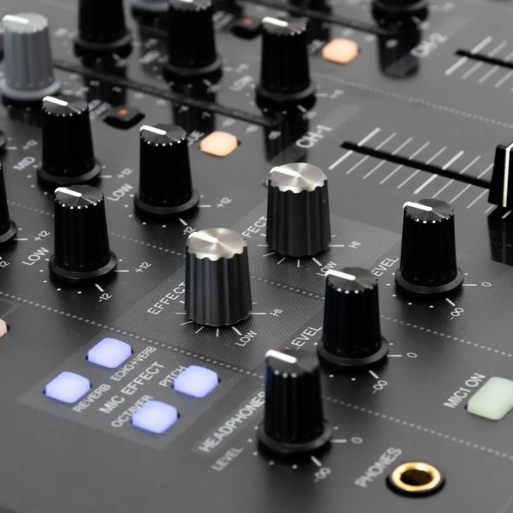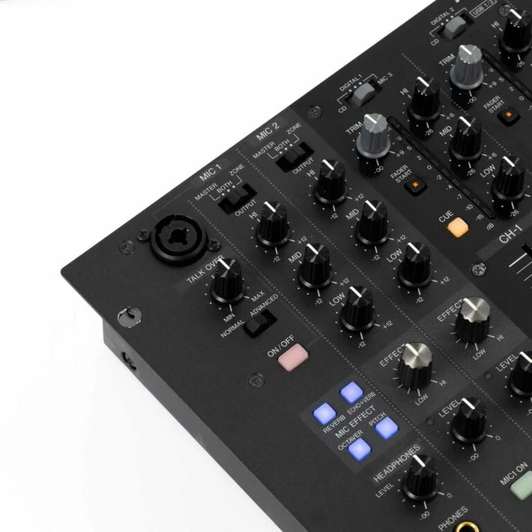 - Ausgänge: 1x Master 1 (Stereo XLR), 1x Zone (Stereo XLR), 1x Master 2 (Stereo Cinch), 1x Booth (Stero 6,3 mm Klinke), 1x Send (Stereo 6,3 mm Klinke)