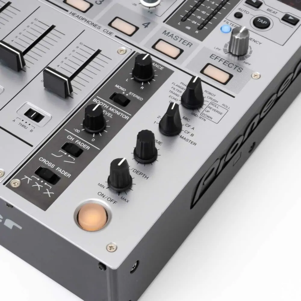 Stabile Pioneer-Qualität zum schmalen Preis? Der DJM 700 könnte der perfekte Mixer für Dich sein. Wenn Du gute Soundqualität und nur die wichtigsten Funktionen benötigst, ist der DJM 700 komplett ausreichend. Der Mixer überzeugt durch den bekannten Aufbau und bietet neben dem standard 3 Band EQ auch eine große Auswahl an integrierten Effekten. Bei diesem Modell liegt gelegentlich ein Fehler vor, dass einer der Fader auf 0 nicht gänzlich das Signal killt.