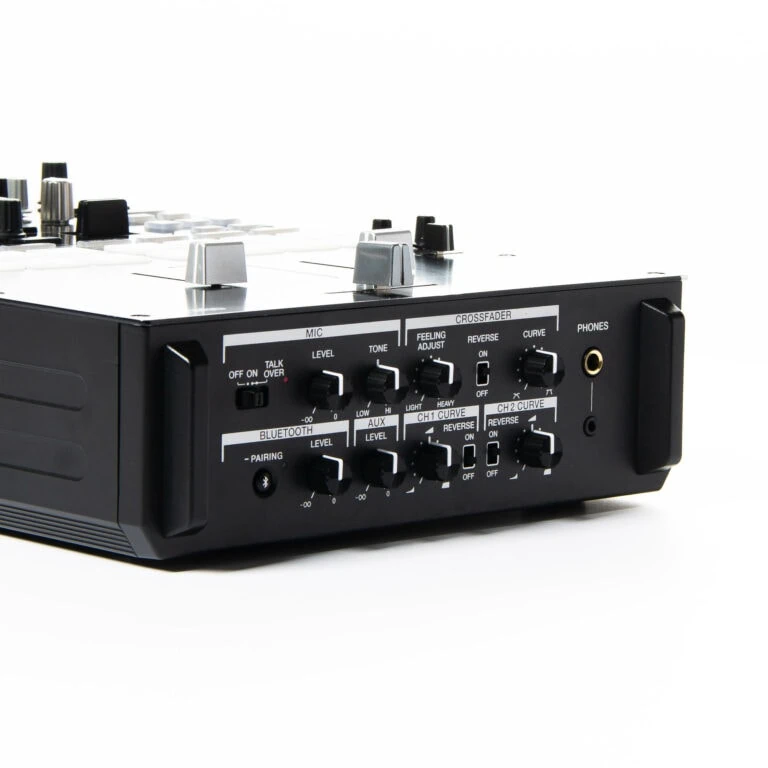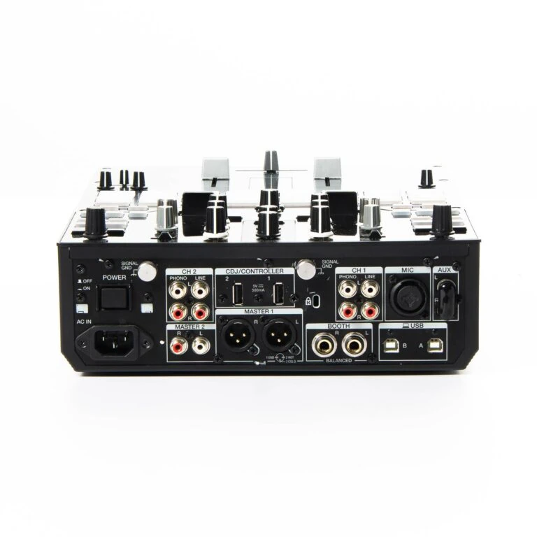 - Ausgänge: 1x Master 1 (Stereo XLR), 1x Master 2 (Stereo Cinch), 1x Booth (Stereo 6,3 mm Klinke), 1x Aux (Stereo Cinch), 1x Record (Stereo Cinch), 1x Phones (6,3 mm Klinke)