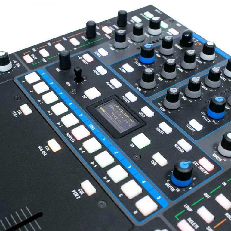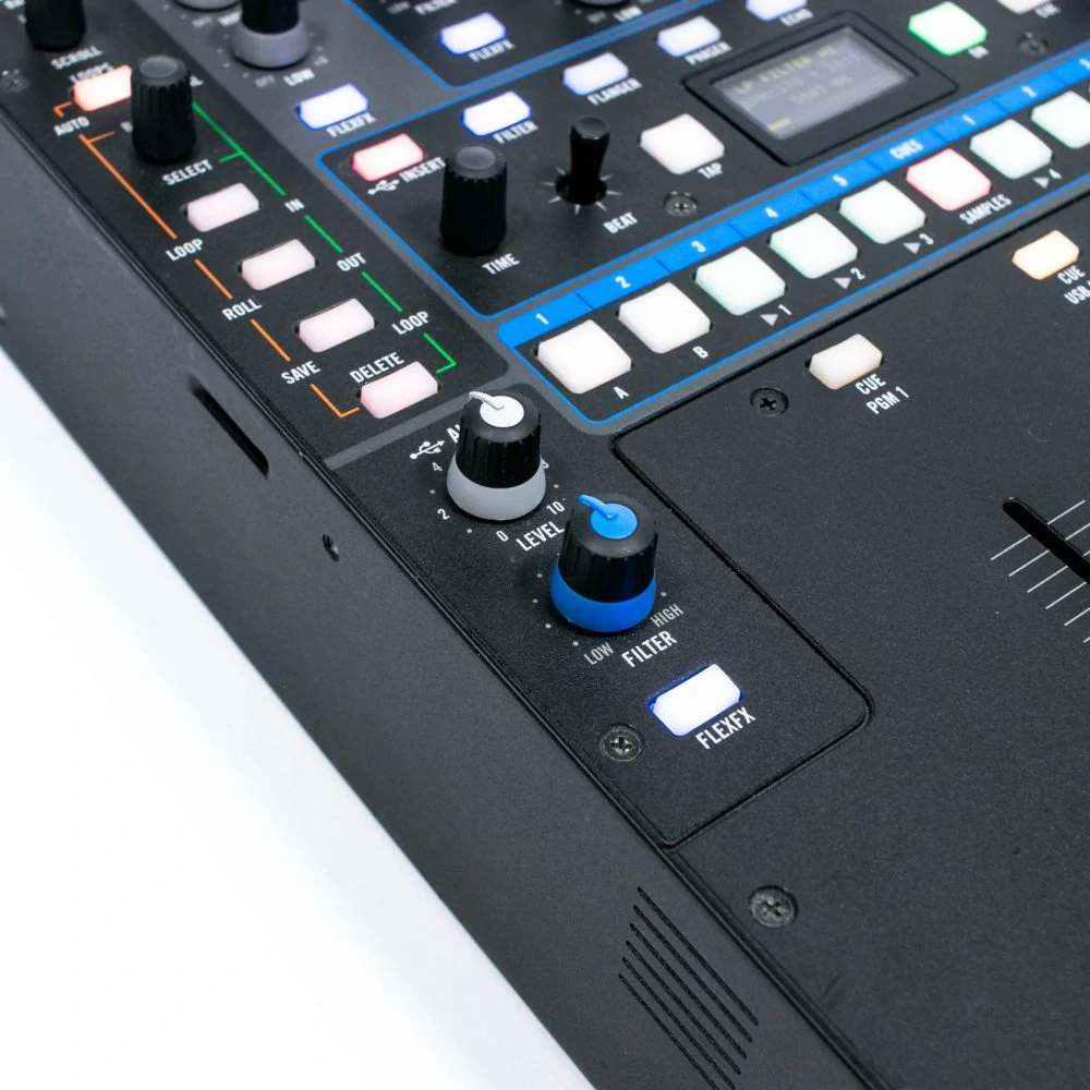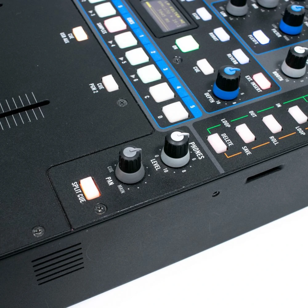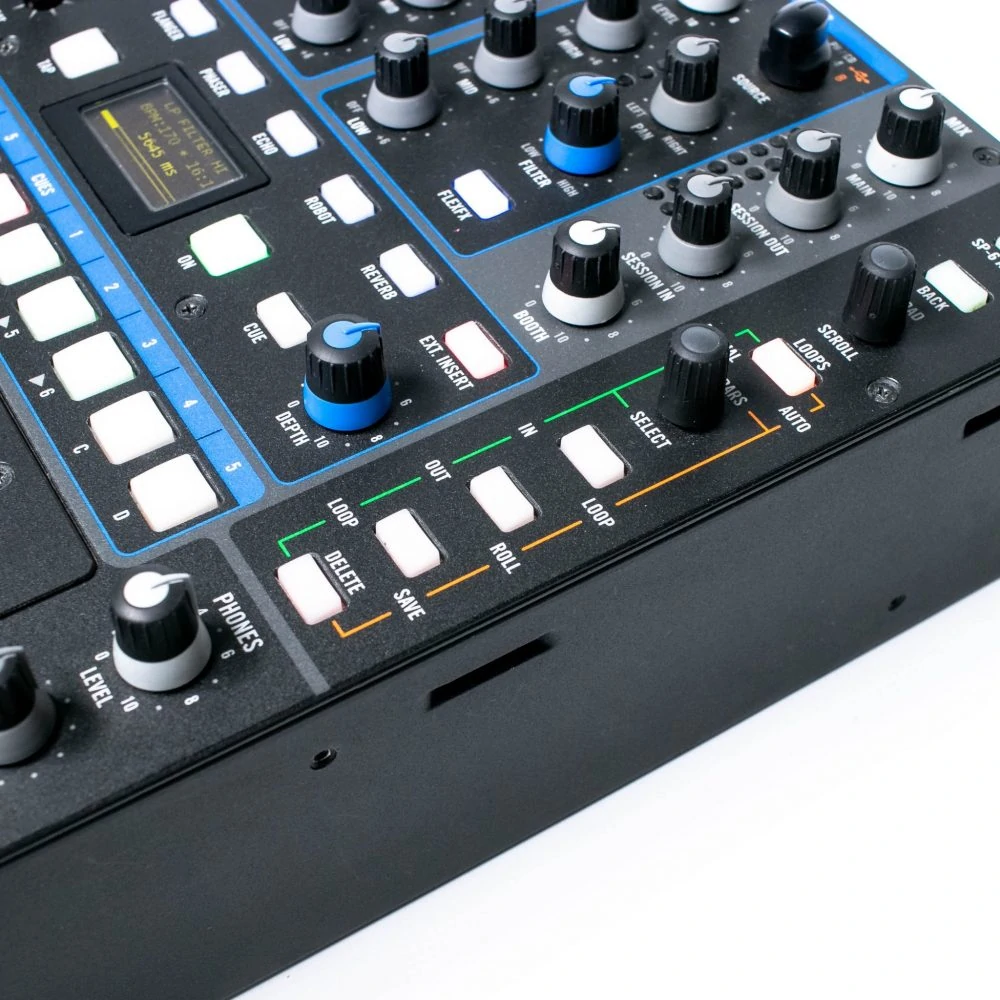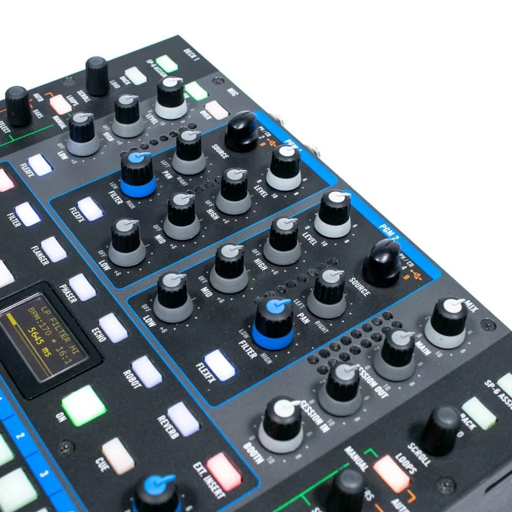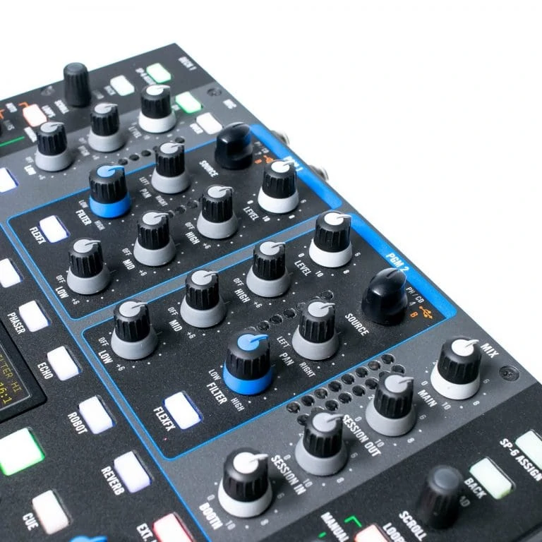 - Eingänge: 4x Line In/Phono (Cinch), 1x Session In (Cinch), 1x FlexFX Loop Return (6,3 mm Klinke), 1x MIC In (XLR/6,3 mm Klinke Combo)
