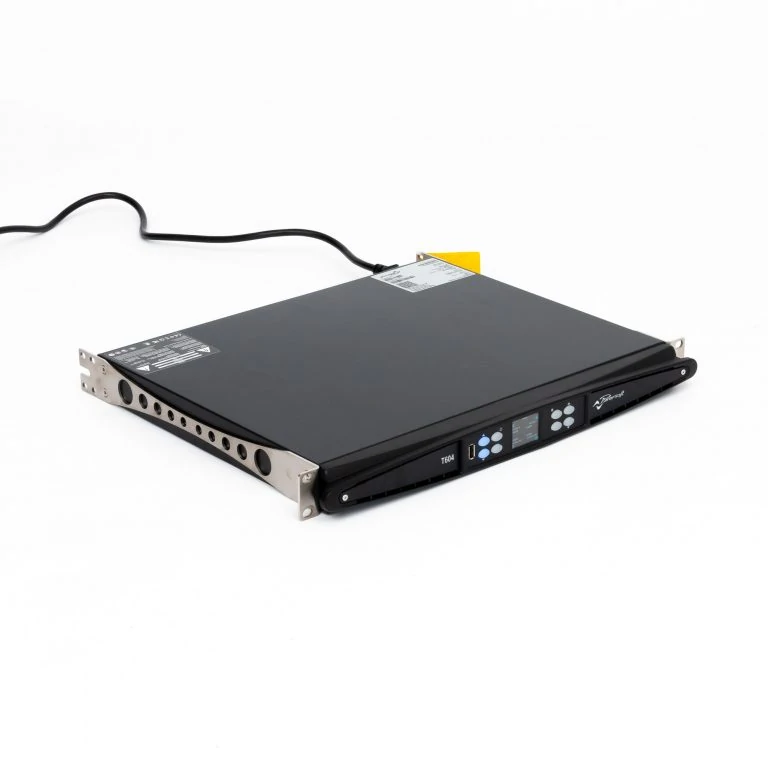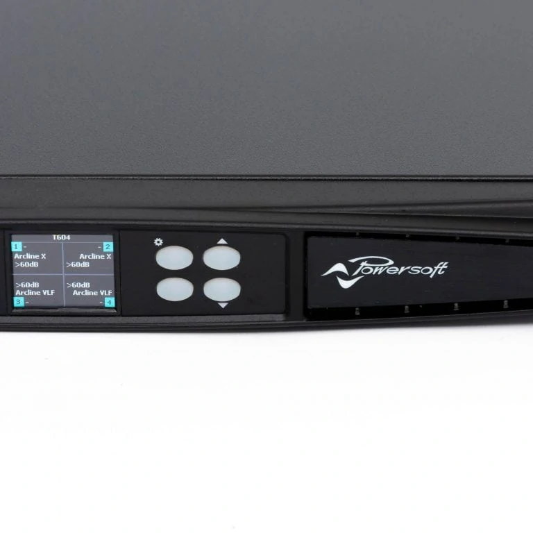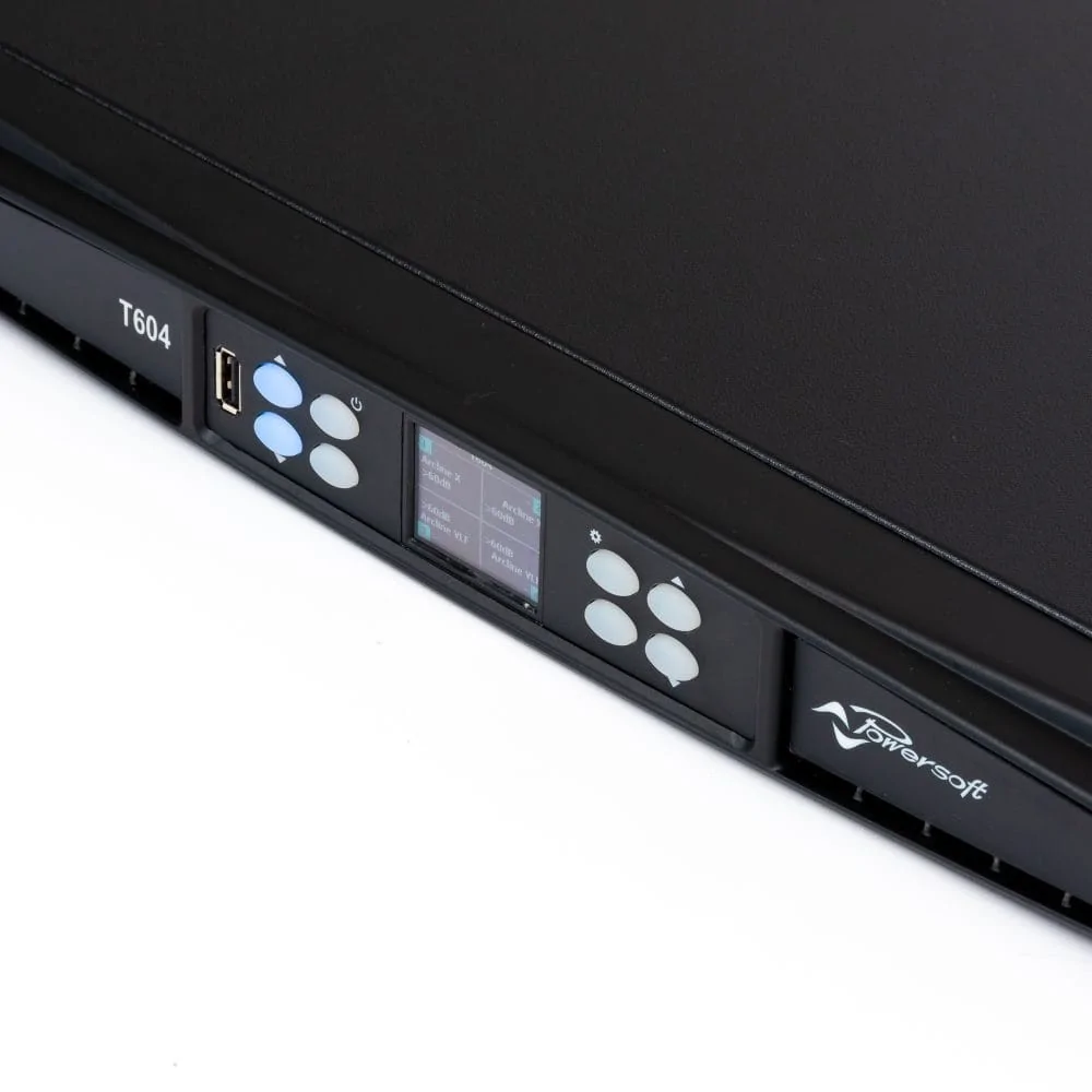 Der Powersoft T604 ist ein zuverlässiger 4-Kanal Verstärker der Oberklasse mit einer Leistung von bis zu 1250 W an 8 Ohm, 1500 W an 4 Ohm oder 1500 W an 2 Ohm pro Kanal. Reduzierte Tiefe und Gewicht eignen sich optimal für den Einbau in ein 19″ Rack. Über das Display lassen sich Presets ansteuern, Gain, Delay und Mute kontrollieren sowie Headroom ablesen. Durch die Kompatibilität mit Armonía Plus ist eine noch genauere Kontrolle und Überwachung möglich. Ein hochprofessioneller und robuster Verstärker für Festinstallationen oder den mobile Einsatz.