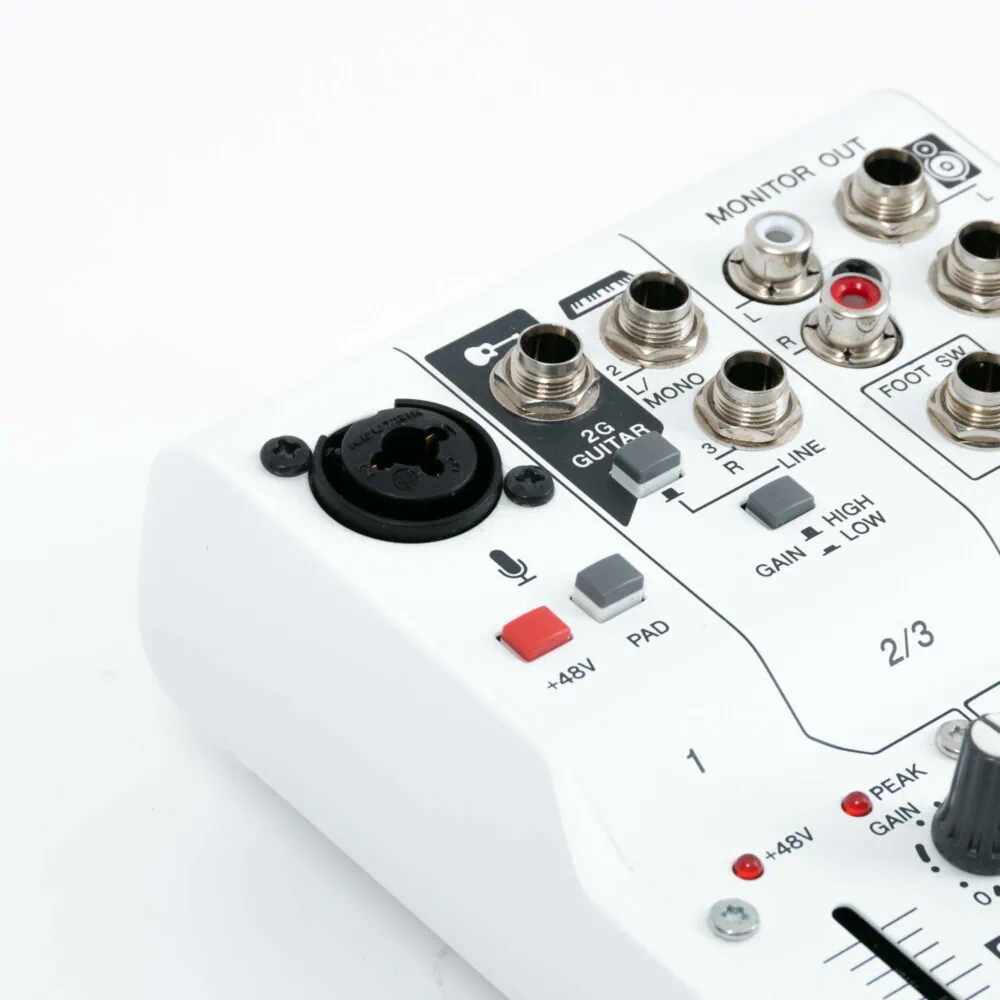 - Eingänge: 1x Mic In (6,3 mm Klinke / XLR Kombo), 3x Line von denen einer auf Hi-Z geschaltet werden kann (6,3 mm Klinke), 1x Headset-Mic (3,5 mm Klinke)