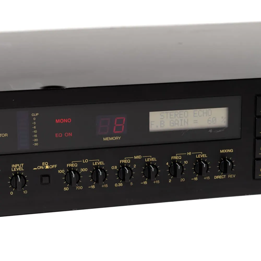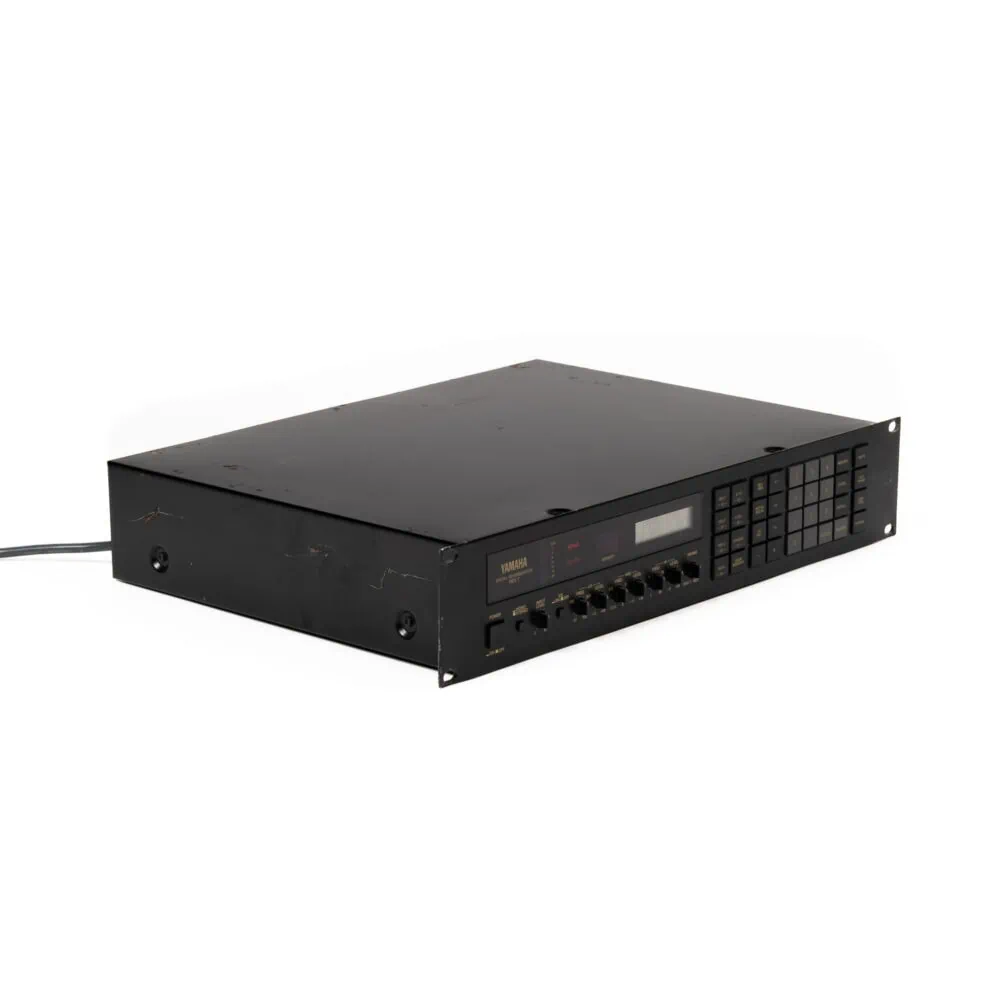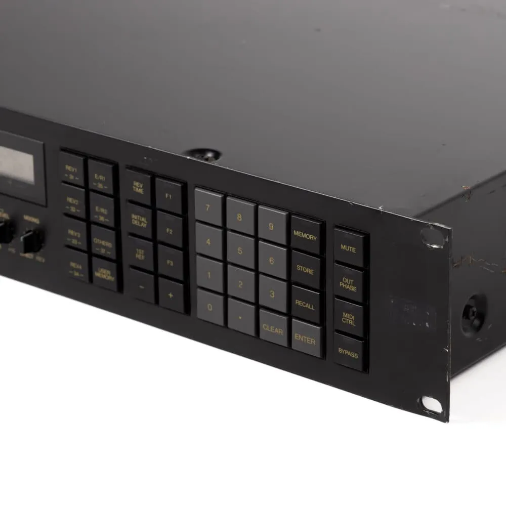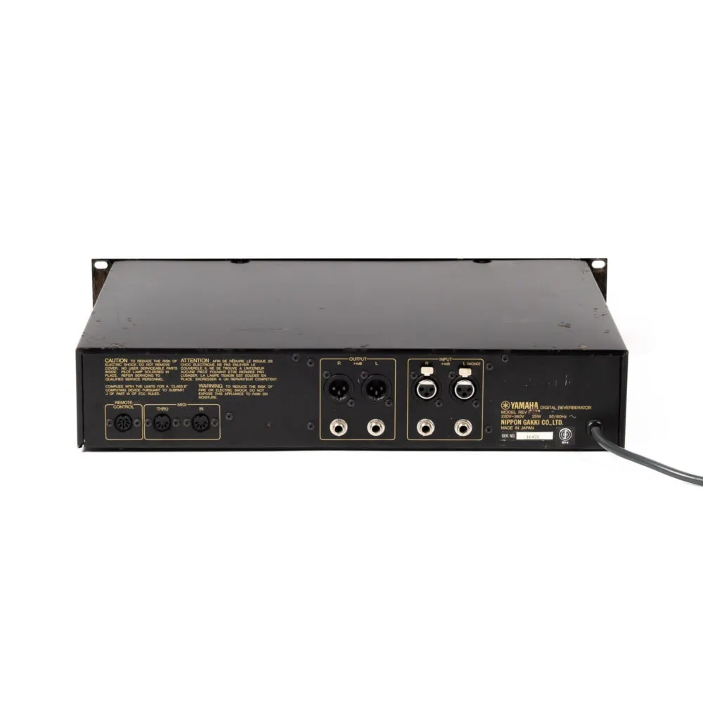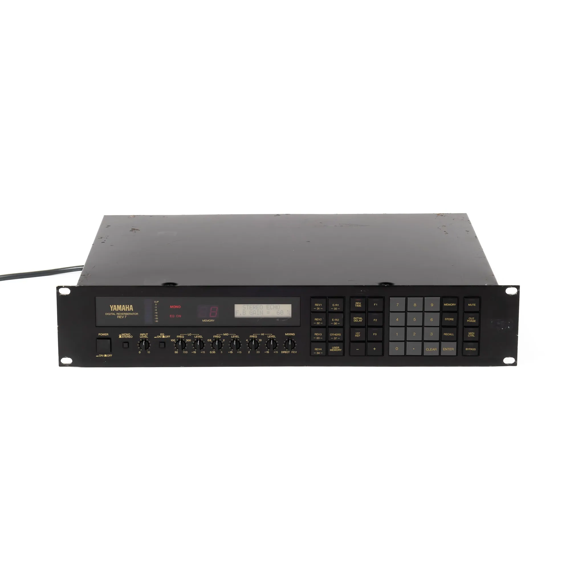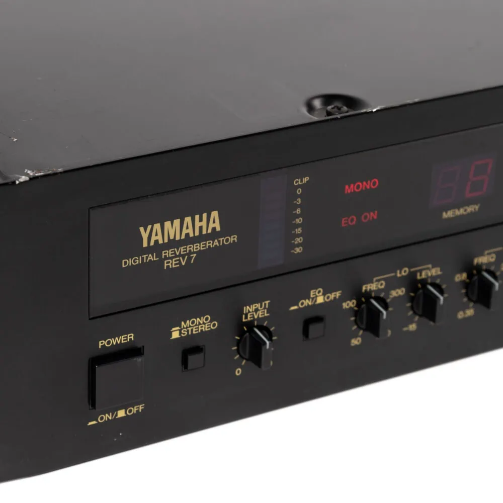 Der Yamaha REV 7 ist ein digitaler Reverberator und bringt Reverbs in Studio Qualität. Eine immense Zahl und Permutationen der Bearbeitungsmöglichkeiten lassen dich das Audiosignal mit Reverb, Echo, Phaser and Flanger bearbeiten. Das Signal wird zunächst equalized, gemessen, und dann durch einen A/D-Wandler geschickt. Das Inputsignal bleibt Stereo während das Reverb Signal als Mono im DSP erstellt wird.