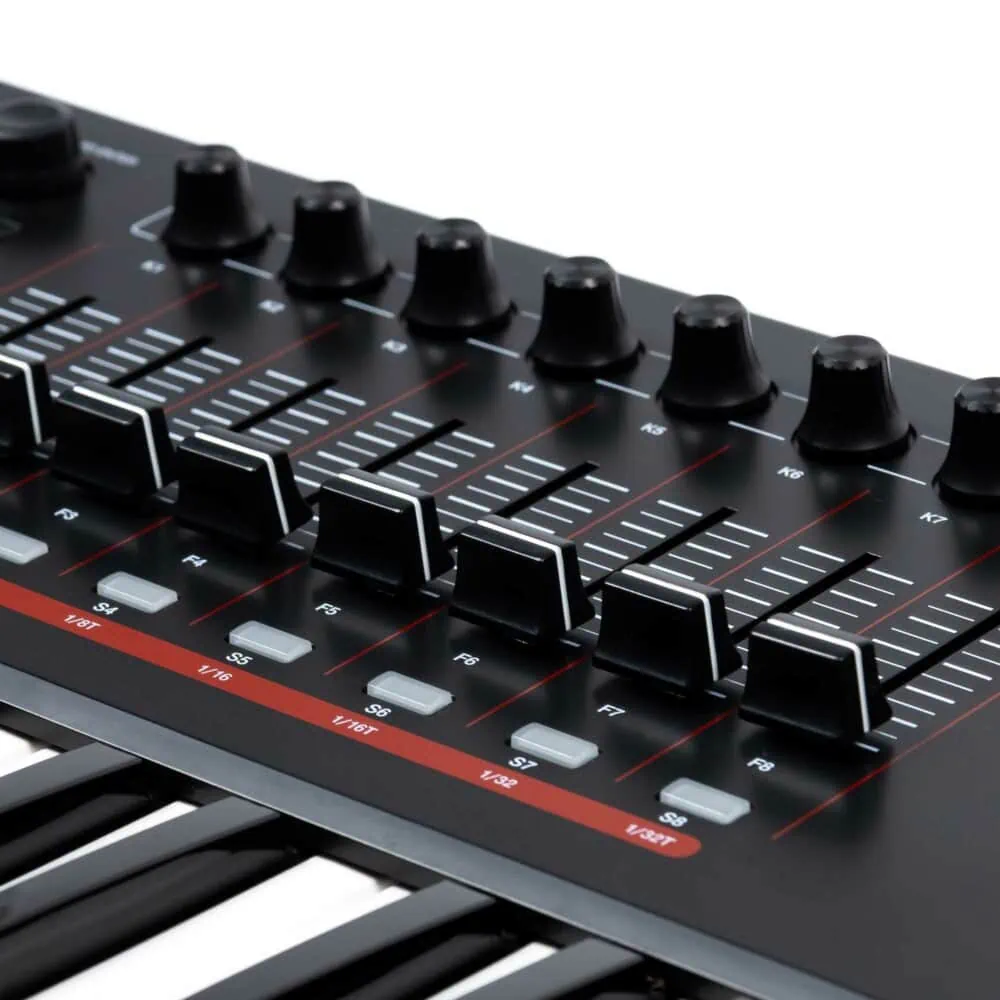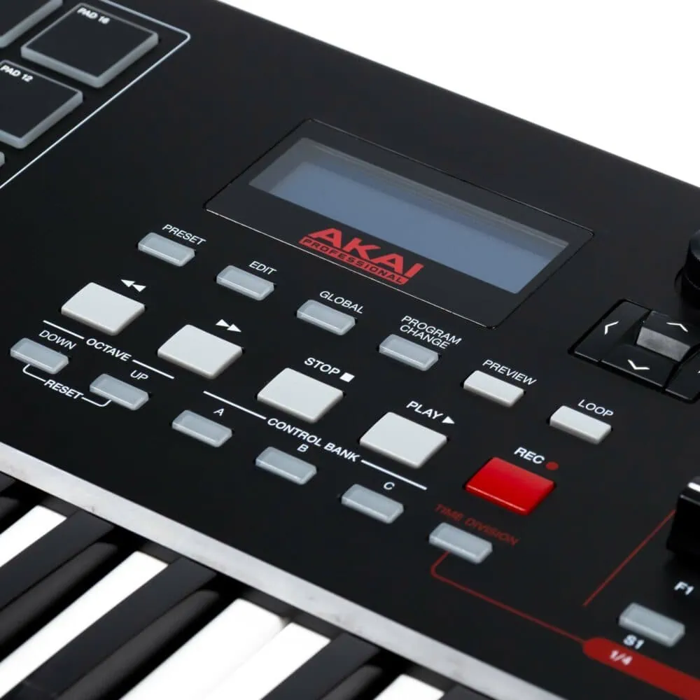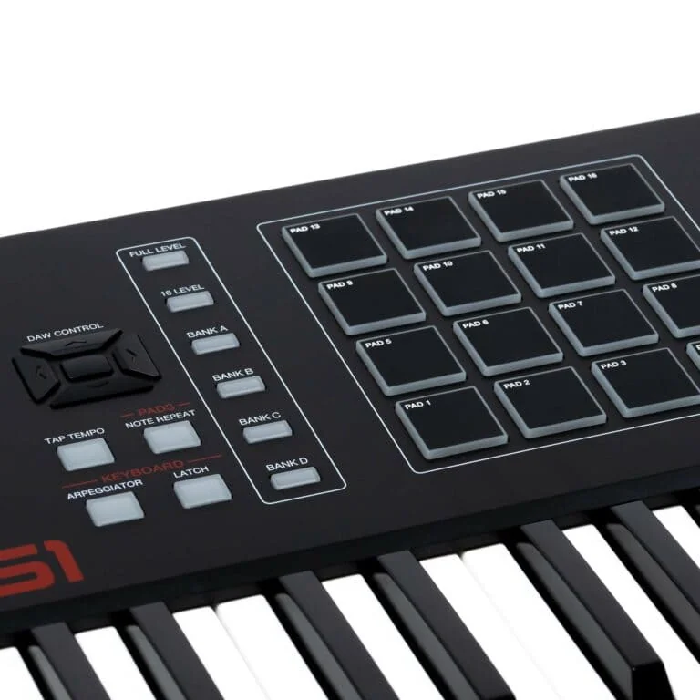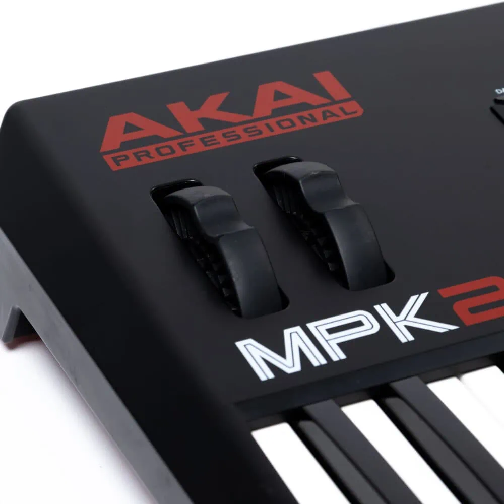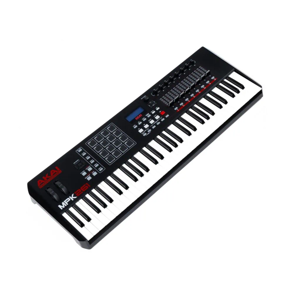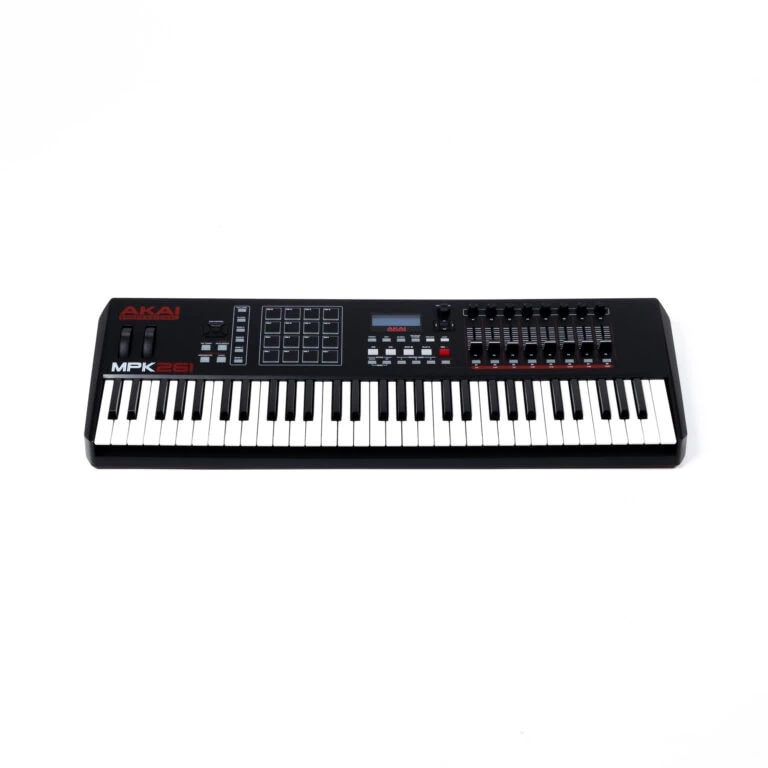 Das Akai MPK 261 ist ein MIDI-Pad und Keyboard Performance Controller. Der USB-gesteuerte Controller bringt 61 semigewichtete Tasten, 16 MPC Pads mit RGB Beleuchtung, acht Regler, die sich frei zuweisen lassen so wie Pitch- und Modulationsrad.