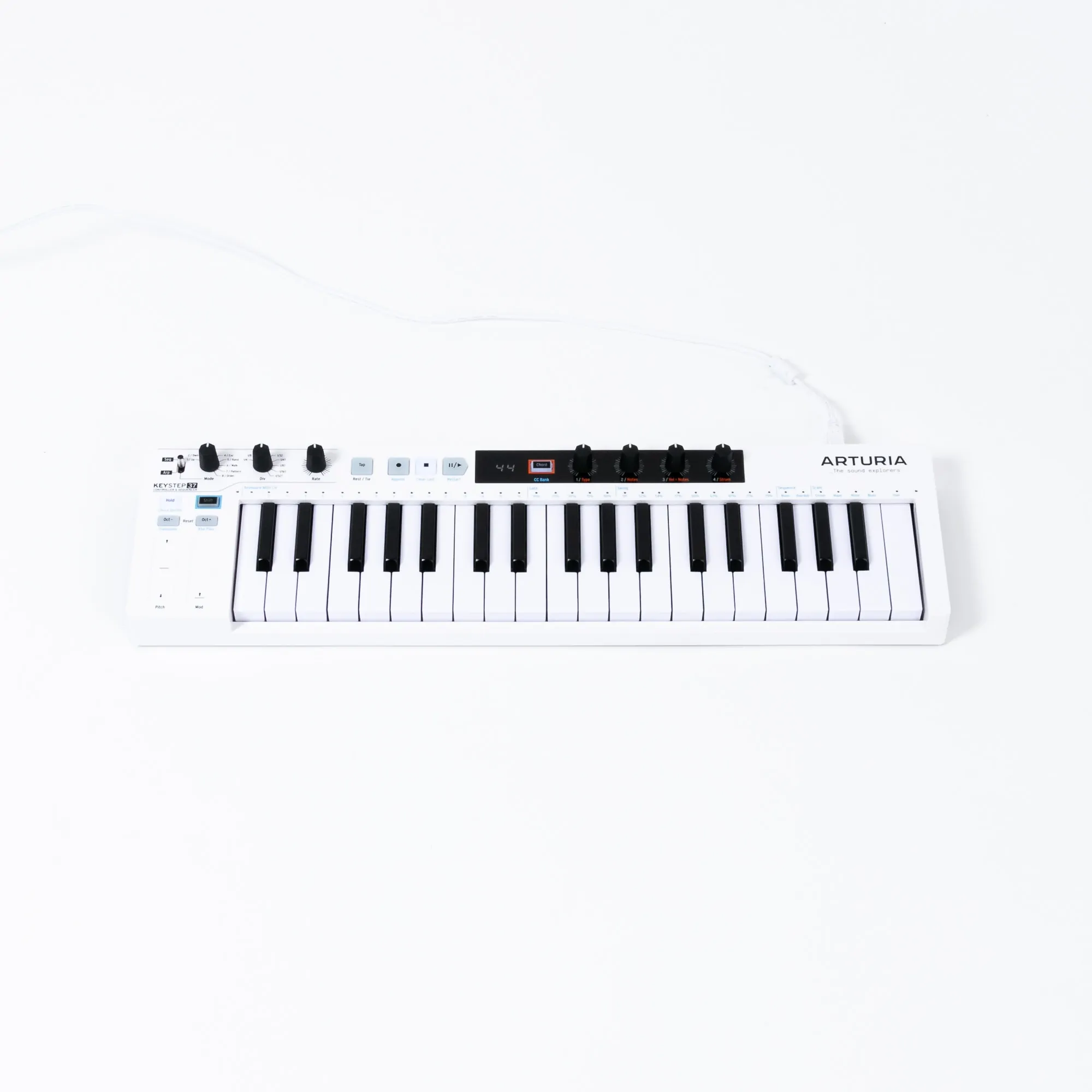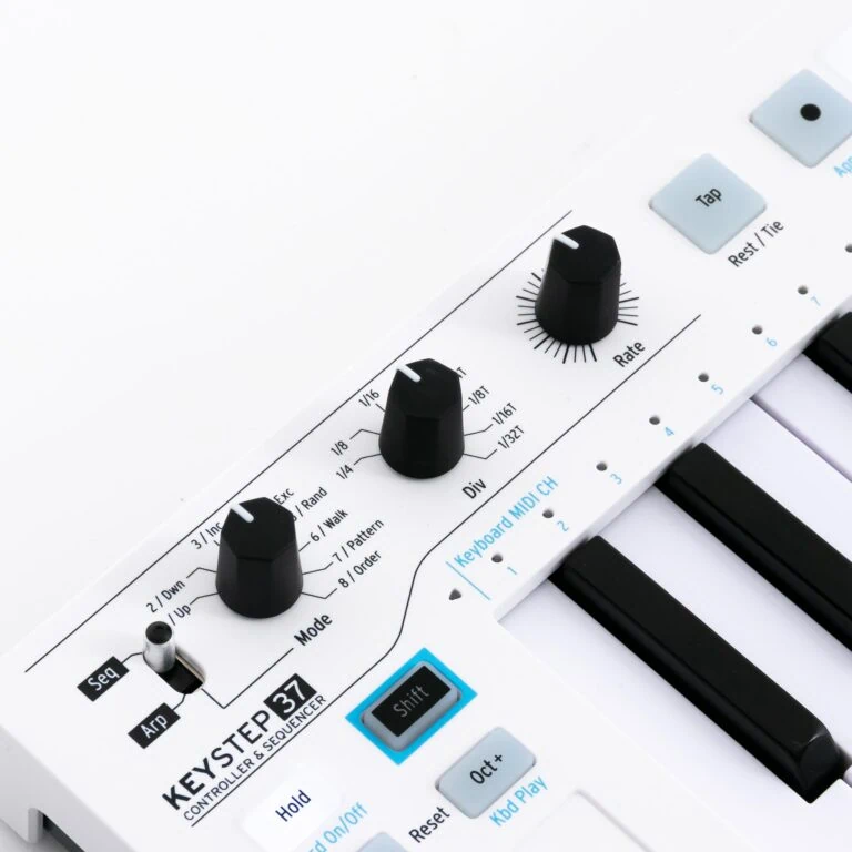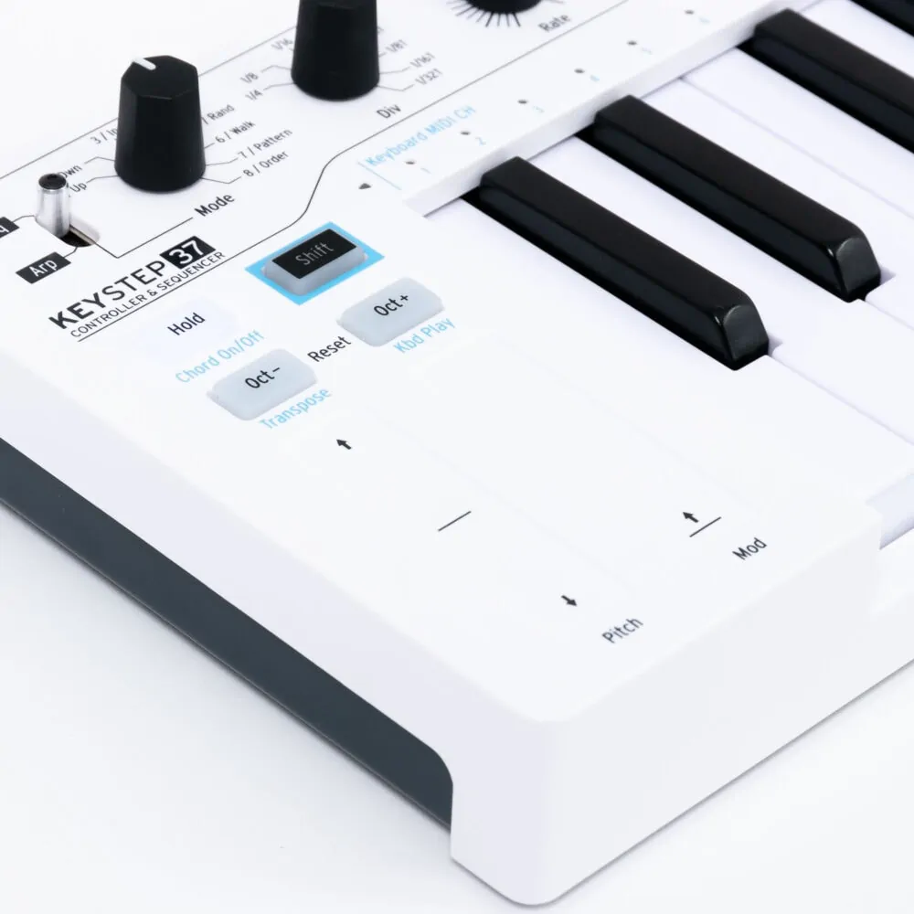 Das Arturia Keystep 37 ist ein USB Controller-Keyboad mit 37 anschlagdynamischen Mini-Tasten. Zusätzlich findet sich ein 64 Sequenzer, eine Arpeggiator-Funktion, vier frei belegbare Regler, ein LED-Display und zwei Touch-Stripes fßr Pitch- und Modulation. Mit diesen Funktionen eignet sich das Arturia Keystep 37 ideal als kleines Master Keyboard fßr deine Produktionen.