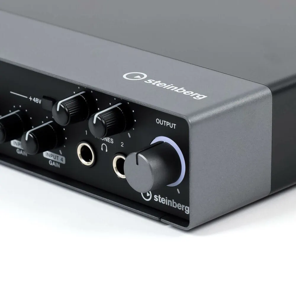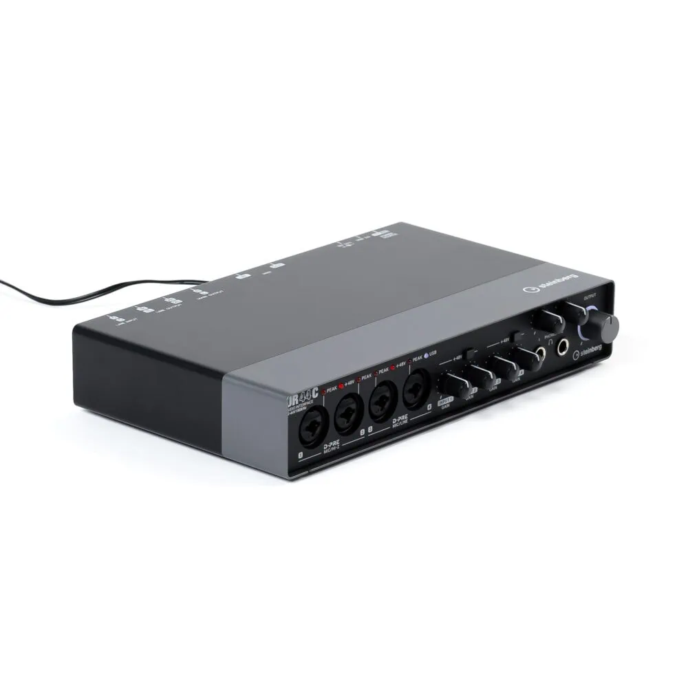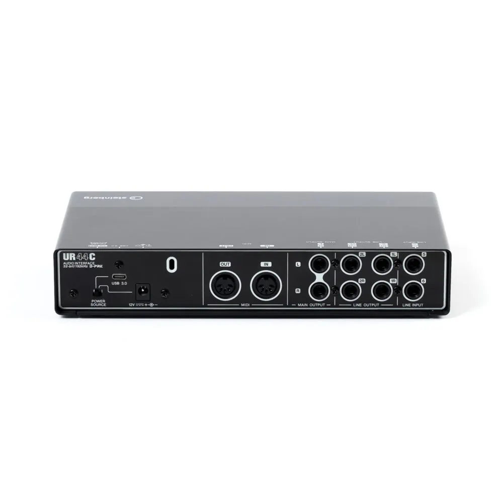 Das Steinberg UR44C ist ein 6 x 4 USB-Audiointerface mit DSP-Prozessor. Auf der Vorderseite sind vier analoge XLR/Klinken-Combo-Eingänge mit Class-A D-PRE Mikrofonverstärker zu finden, welche sich alle mit separaten Regler einstellen lassen. Die Rückseite bietet zwei weitere 6,3 mm-Eingänge, sowie drei Stereo-Outputs. Die verbauten Wandler mit einer Sampling Rate von bis zu 192 kHz der UR-C-Serie liefern einen hochqualitativen Klang. Seine robuste Bauweise, sowie die Stromversorgung (optional nur über USB-C) machen das UR44C zu einem äußert mobilen Interface. Per MIDI-Ein- und Ausgänge lassen sich alle MIDI-kompatiblen Geräte anschließen und ansteuern. Alles in allem ein vielseitiges und kompaktes Audiointerface zum fairen Preis!