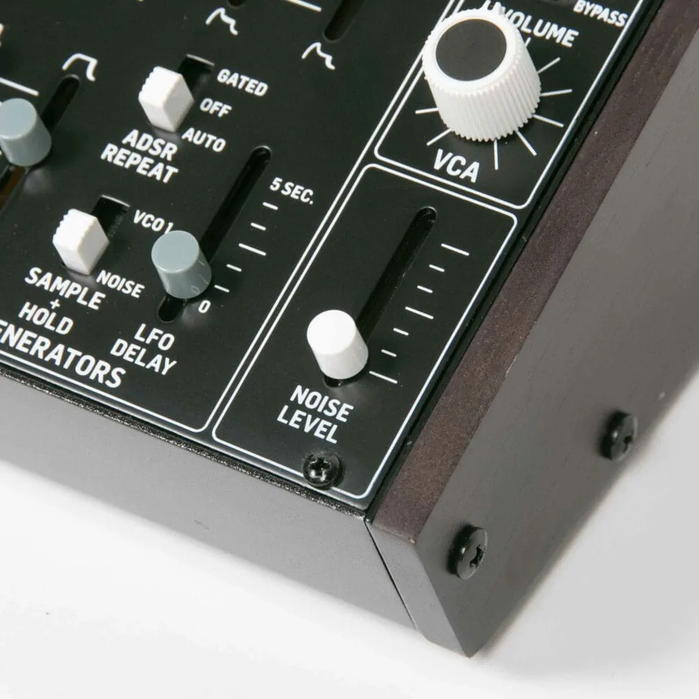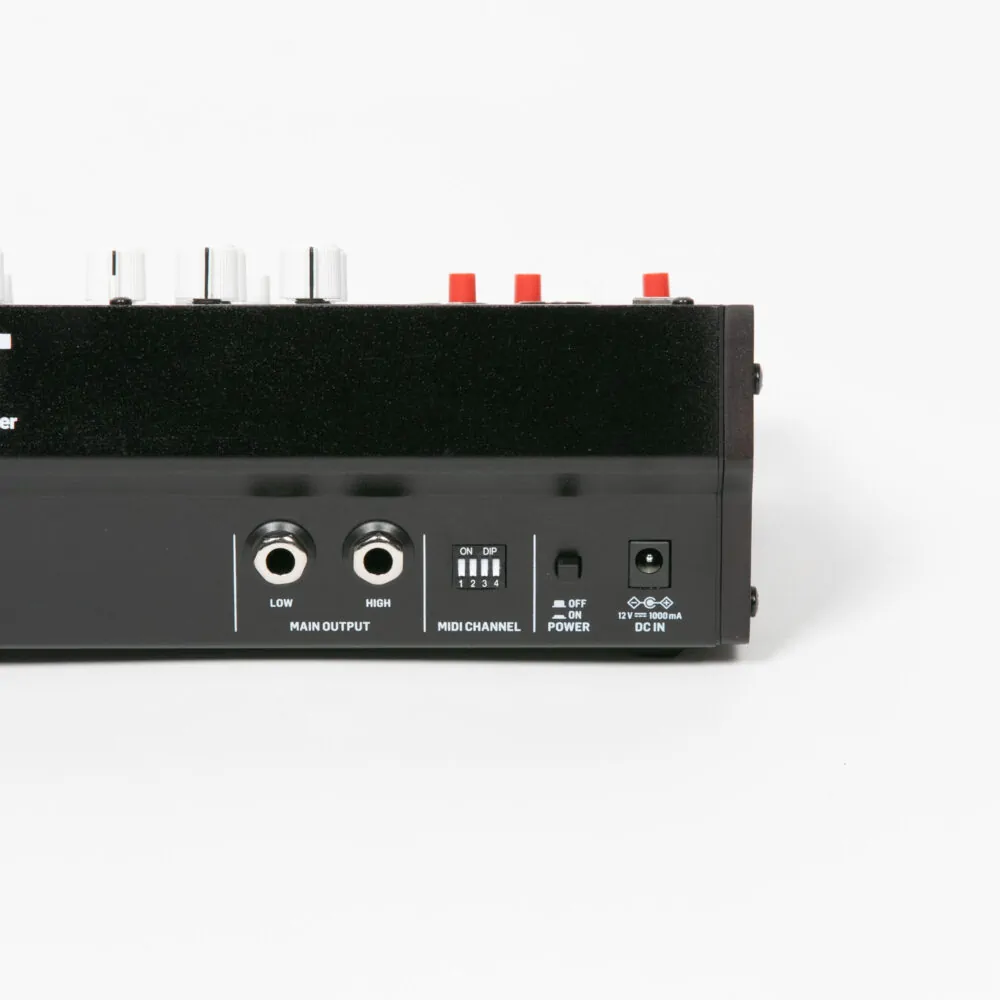 - Eingänge: 1x VC01 VC (3,5 mm Klinke), 1x VC02 (3,5 mm Klinke), 1x Gate (3,5 mm Klinke), 1x VCF Fc (3,5 mm Klinke), 1x VCF Q (3,5 mm Klinke), 1x Ext Audio (3,5 mm Klinke), 1x VCA CV (3,5 mm Klinke), 1x MIDI IN (DIN 5-pol)