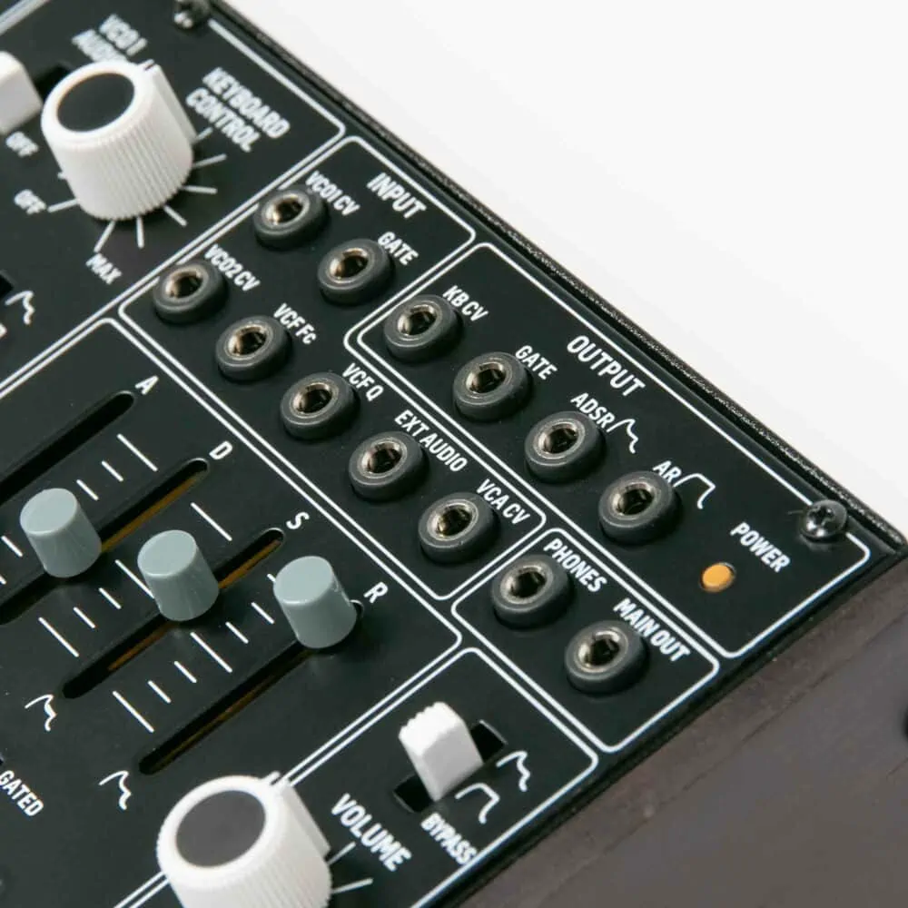- Ausgänge: 1x Main Out (Stereo 6,3 mm Klinke), 1x Main Out (3,5 mm Klinke), 1x MIDI Out (DIN 5-pol), 1x Phones (3,5 mm Klinke), 1x KB CV (3,5 mm Klinke), 1x Gate (3,5 mm Klinke), 1x ADSR (3,5 mm Klinke), 1x AR (3,5 mm Klinke)
