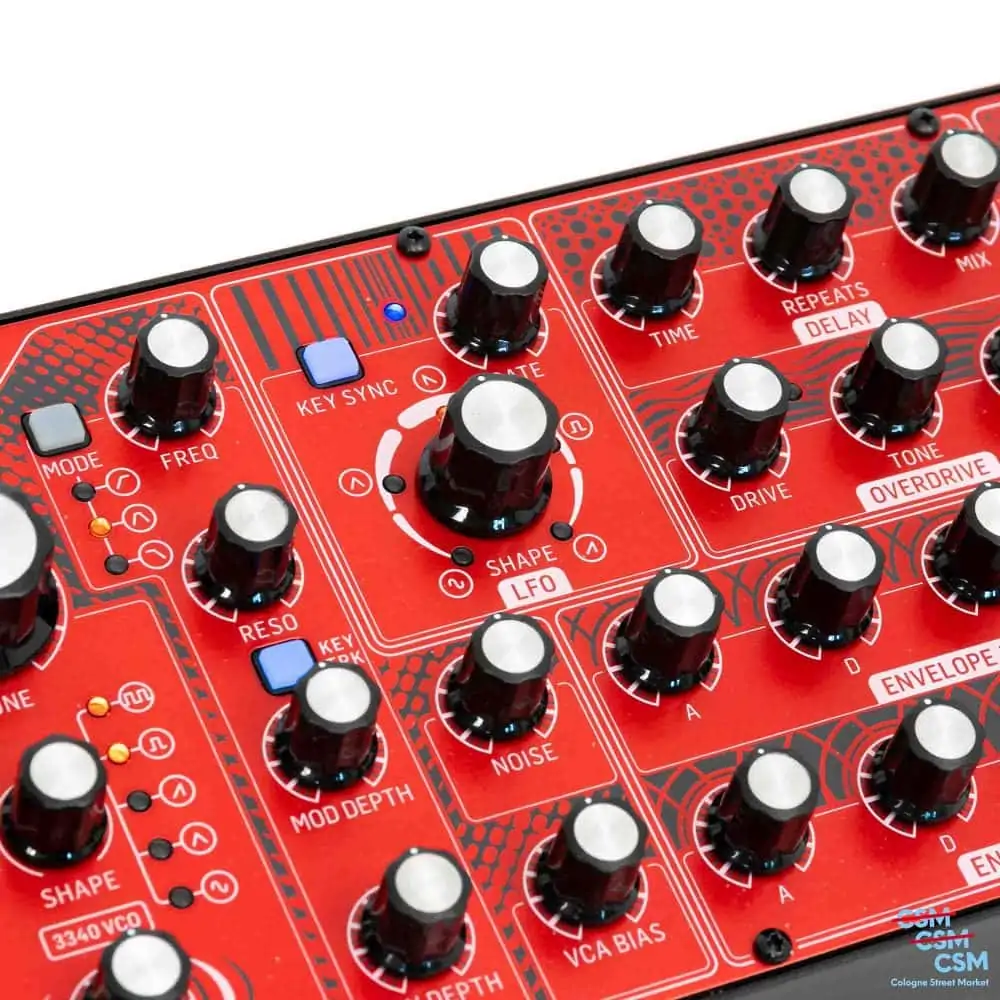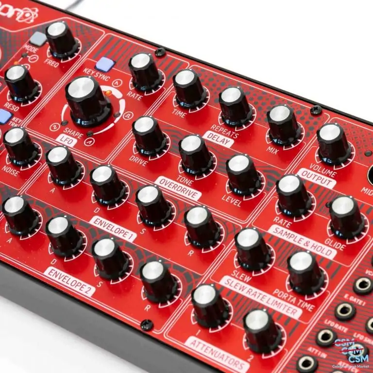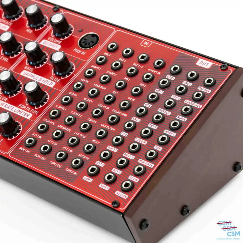 - Anschlüsse: 1x Input (6,3 mm Klinke), 1x Output (6,3 mm Klinke), 1x Phones (6,3 mm Klinke), 1x MIDI (Din 5-pol)