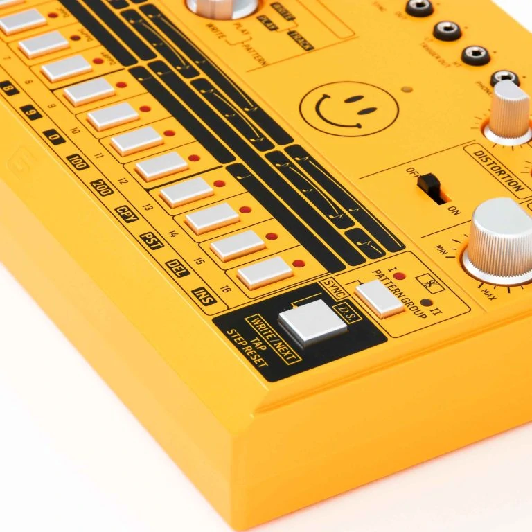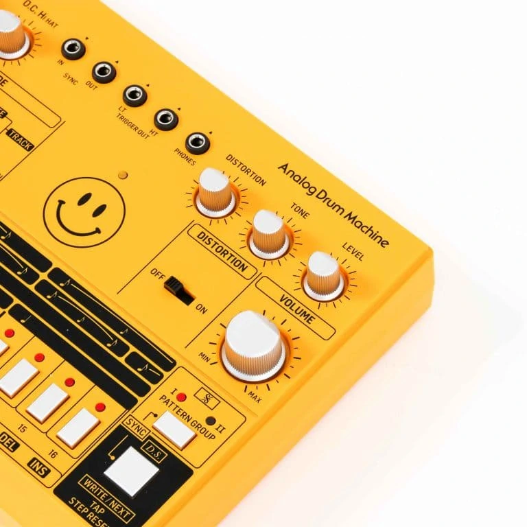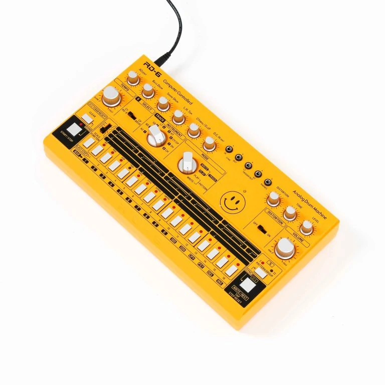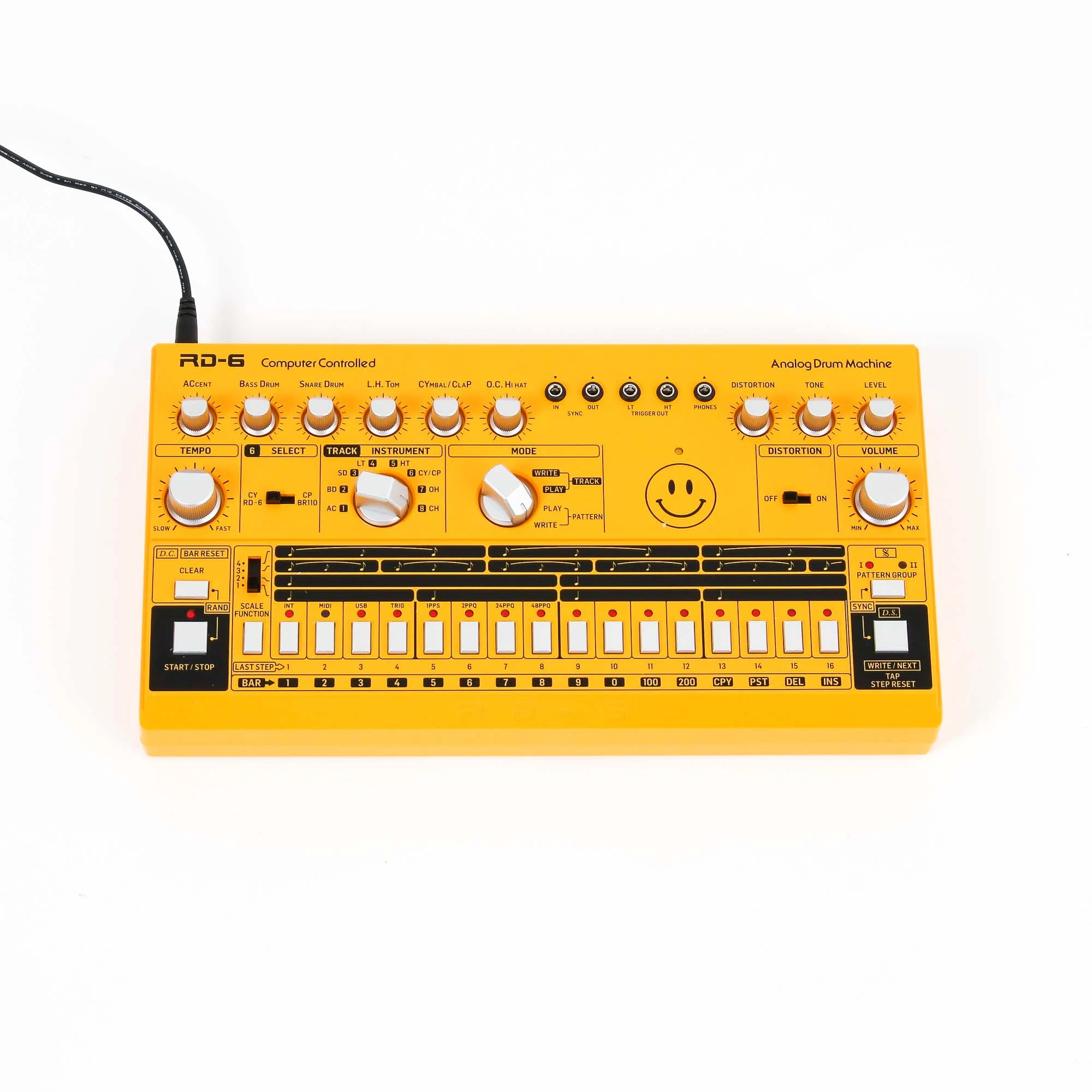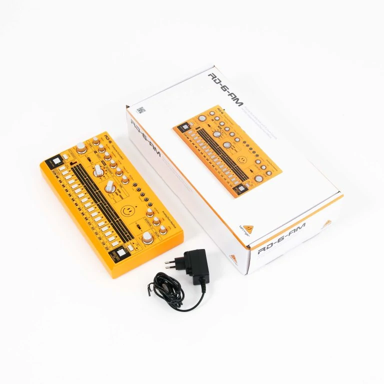 Die Behringer RD 6 AM ist die Acid Smiley Edition der Behringer RD 6 und ebenfalls ein Klon der legendären Roland TR-606. Der zeitlose Sound der Drum Machine lässt sich in alle Songs einbauen die Punch oder einfach etwas Struktur brauchen. Ursprünglich als Begleitelement für Live-Musik gedacht, lässt sich der Sound dieser Drums heutzutage nicht mehr aus der elektronischen Musikwelt wegdenken. Es lassen sich acht Instrumente und Akzente programmieren. Die Kick Drum sowie die Snare haben eigene Lautstärkeregler und Toms, Hi-Hats und Cymbal/Clap sind in Paaren aufgebaut. Natürlich darf in der Behringer RD 6 AM der 16-Stepsequencer nicht fehlen! Mit diesem lassen sich bis zu 32 Patterns programmieren. Die Randomize-Funktion erlaubt es dir sogar, zufällige Drumpatterns zu generieren! Besonders Freunde von härterem Sound werden sich über die Distortion-Funktion freuen, die Behringer noch als neues Feature hinzugefügt hat. Du willst groovy und klatschende Rythmen designen? Dann ist die Behringer RD 6 AM genau richtig für dich!