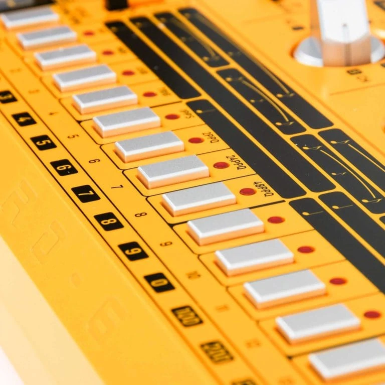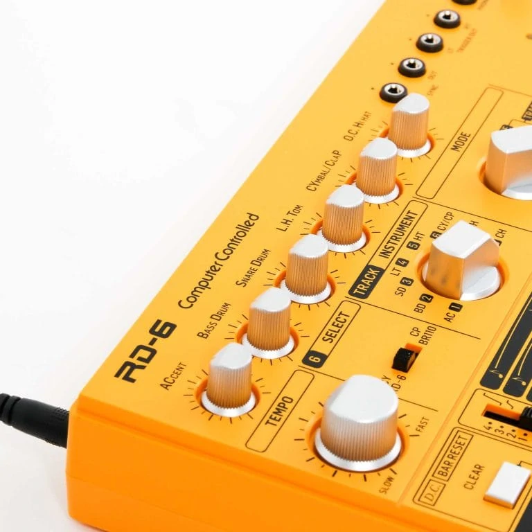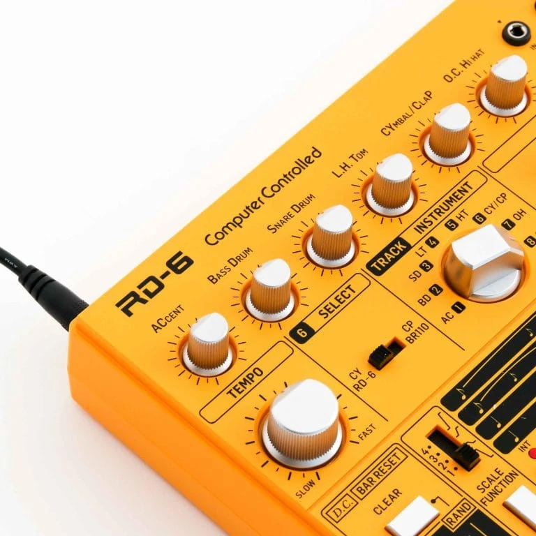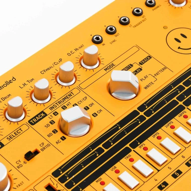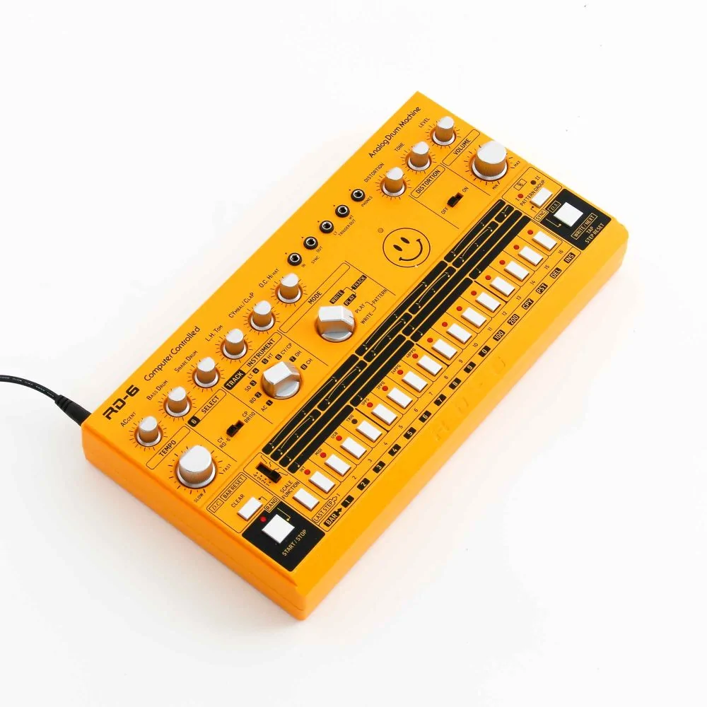 Die Behringer RD 6 AM ist die Acid Smiley Edition der Behringer RD 6 und ebenfalls ein Klon der legendären Roland TR-606. Der zeitlose Sound der Drum Machine lässt sich in alle Songs einbauen die Punch oder einfach etwas Struktur brauchen. Ursprünglich als Begleitelement für Live-Musik gedacht, lässt sich der Sound dieser Drums heutzutage nicht mehr aus der elektronischen Musikwelt wegdenken. Es lassen sich acht Instrumente und Akzente programmieren. Die Kick Drum sowie die Snare haben eigene Lautstärkeregler und Toms, Hi-Hats und Cymbal/Clap sind in Paaren aufgebaut. Natürlich darf in der Behringer RD 6 AM der 16-Stepsequencer nicht fehlen! Mit diesem lassen sich bis zu 32 Patterns programmieren. Die Randomize-Funktion erlaubt es dir sogar, zufällige Drumpatterns zu generieren! Besonders Freunde von härterem Sound werden sich über die Distortion-Funktion freuen, die Behringer noch als neues Feature hinzugefügt hat. Du willst groovy und klatschende Rythmen designen? Dann ist die Behringer RD 6 AM genau richtig für dich!