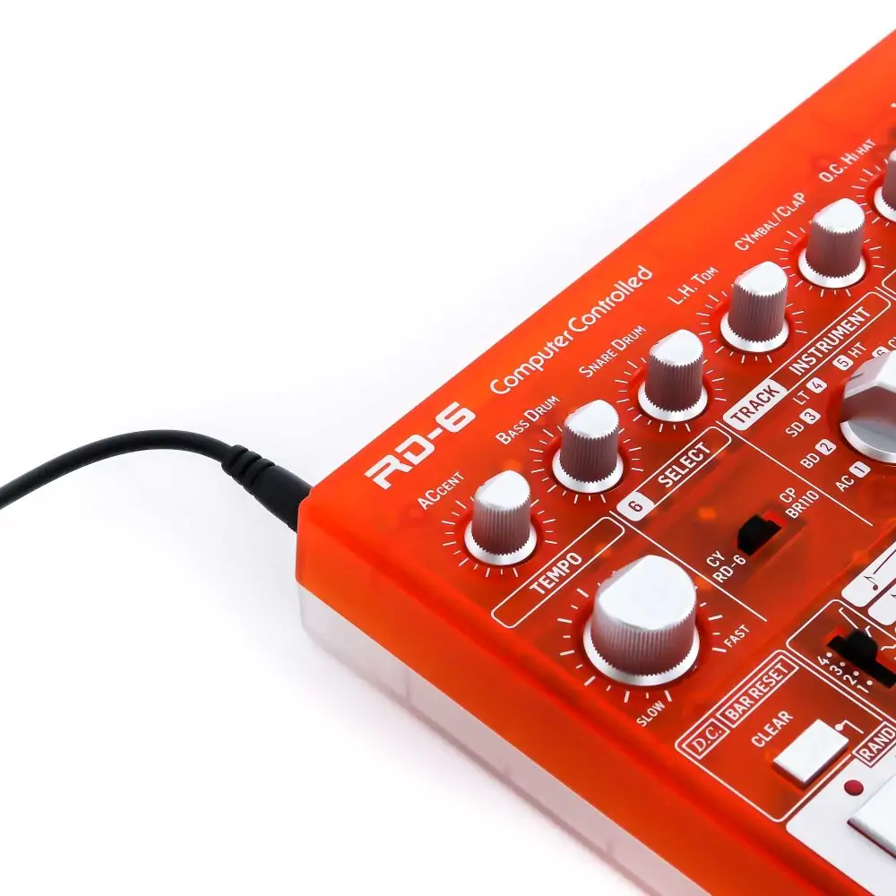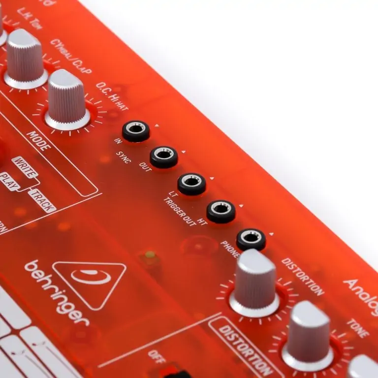 - Anschlüsse: 1x Sync In (3,5 mm Klinke), 1x Sync Out (3,5 mm Klinke), 1x Low Tom Trigger (3,5 mm Klinke), 1x Hi Tom (3,5 mm Klinke), 1x Phones (3,5 mm Klinke), 6x Voice Out (3,5 mm Klinke), 1x Mix Out (6,3 mm Klinke), 1x Start / Stop (6,3 mm Klinke), 1x MIDI In (DIN 5-pol), 1x MDI Out/Thru (DIN 5-pol), 1x USB-B