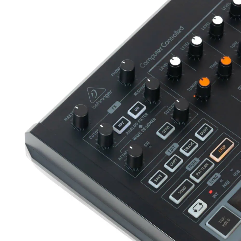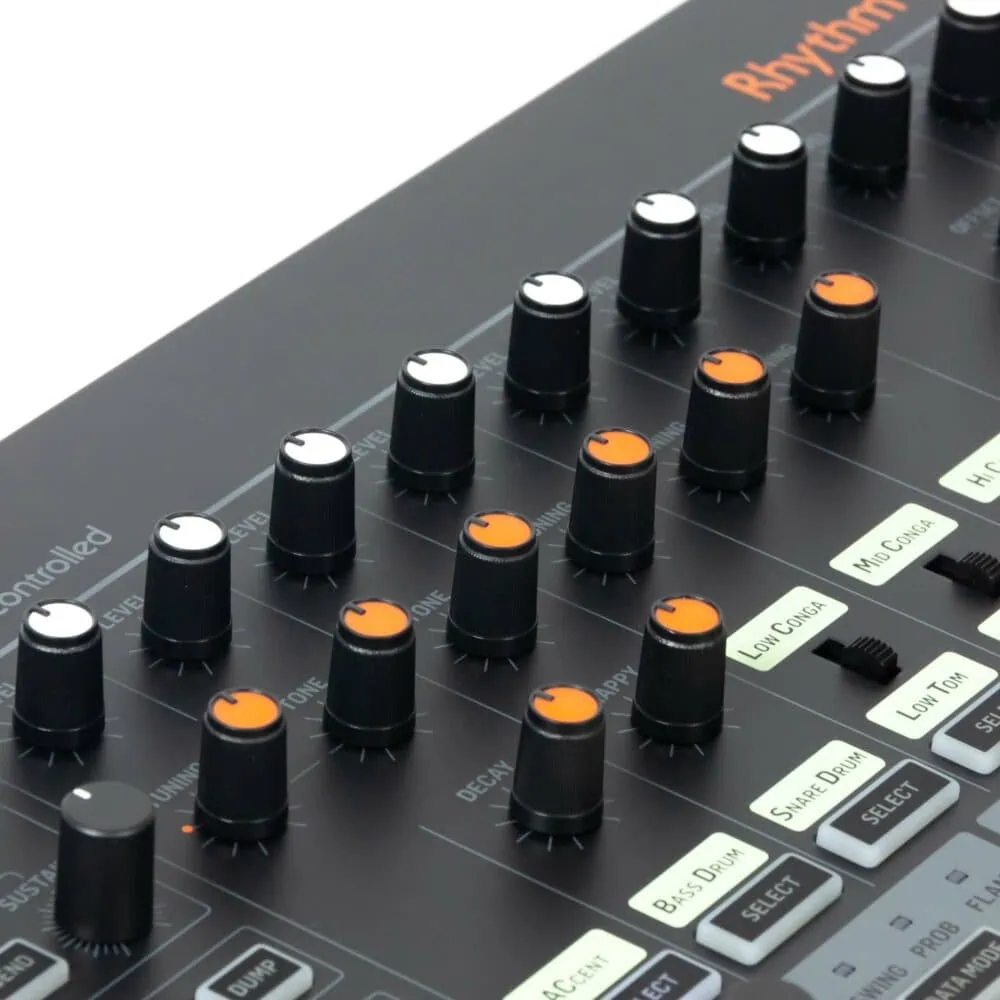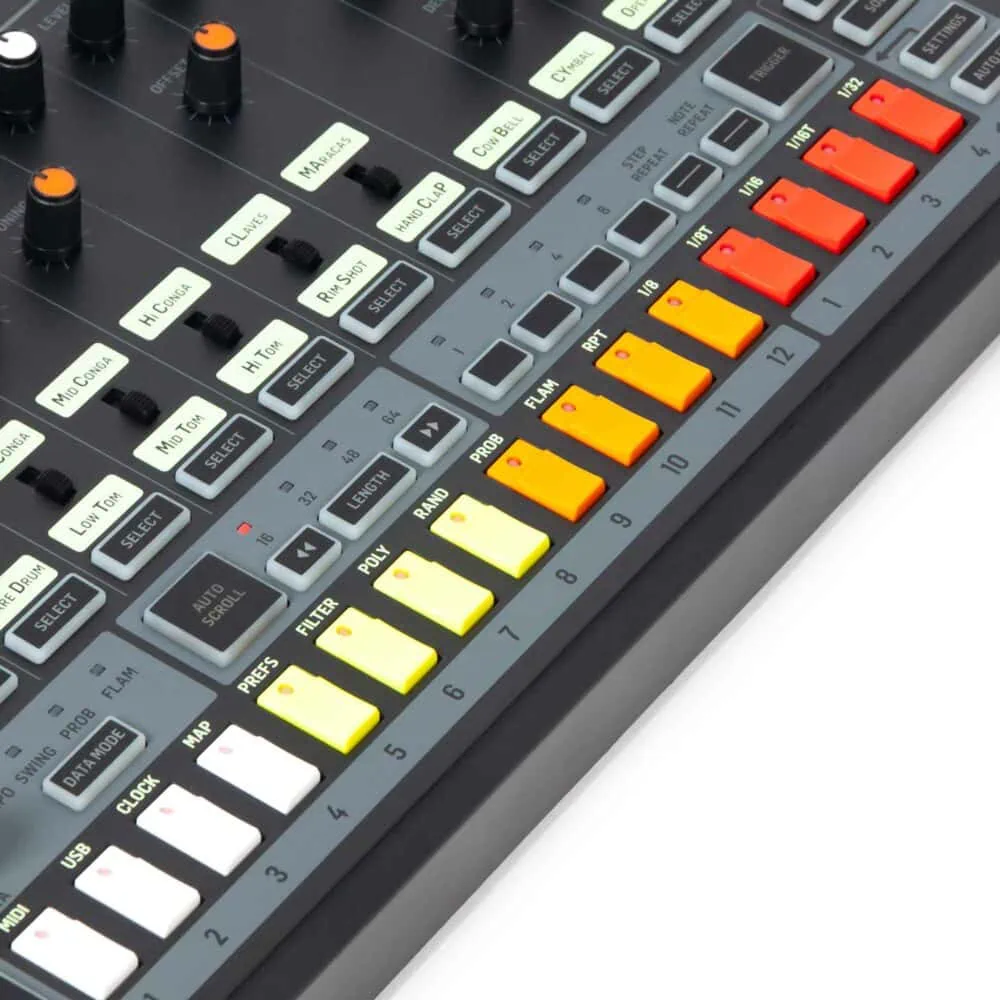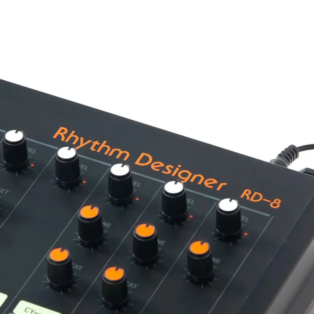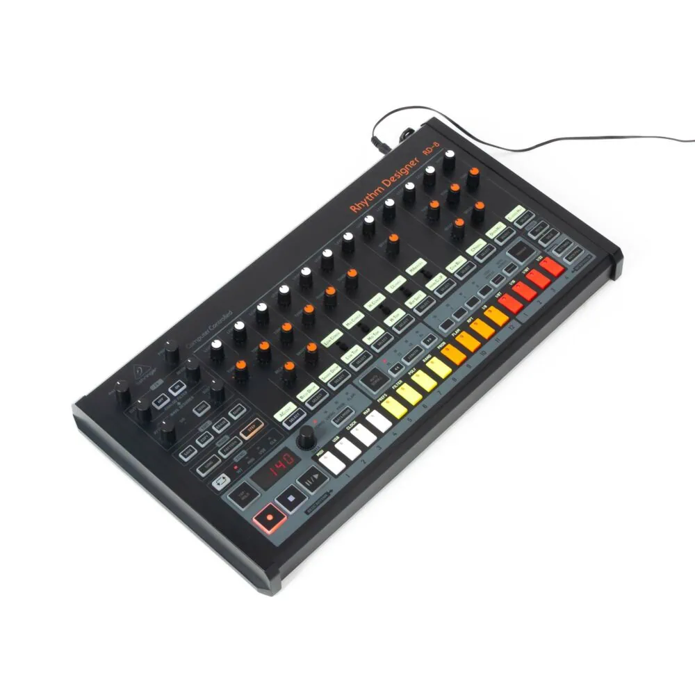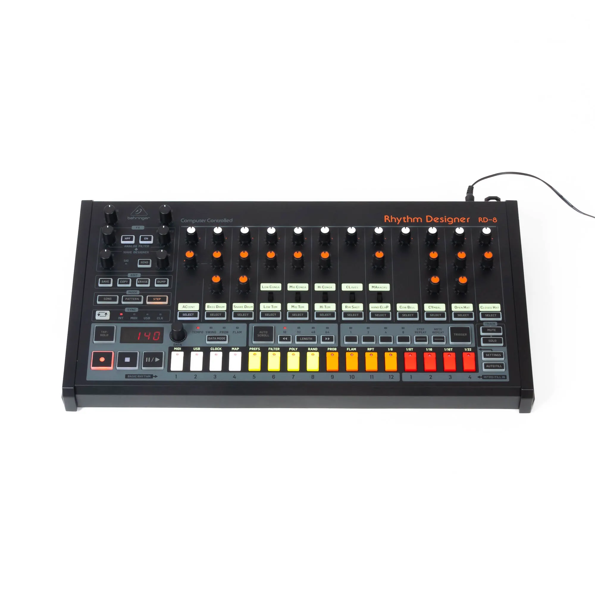 Der Behringer RD 8 ist ein analoger Drumcomputer, der die Klänge der legendären Roland 808 wieder aufleben lässt. Er adaptiert dabei den authentischen, analogen Sound der 808 bis ins letzte Detail und erweitert diesen mit Spielerein wie Step Repeat Mode oder Note Repeat. 16 Instrumente auf 11 Spuren verteilt lassen sich über den Sequenzer mit 64 Steps und 256 Pattern programmieren und per Drehregler in ihren Parametern einstellen. Natürlich darf auch nicht der typische Shuffle und Flam für den echten Oldschool-Vibe fehlen. Darüber hinaus kannst du in dieser Neuauflage im Hauptausgang mit einem Lowpass/Highpass-Filter schnell agieren oder mit dem Wave Designer die Dynamik des Outputs beeinflussen. Mit dem Behringer RD 8 kannst du dir endlich den ikonischen Sound der 808 zu einem erschwinglichen Preis zu dir nach Hause holen!