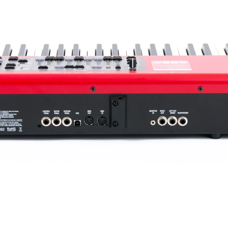 - Anschlüsse: 1x Cotrol Pedal (6,3 mm Klinke), 1x Rotor Pedal (6,3 mm Klinke), 1x Sustainable Pedal (6,3 mm Klinke), 1x MIDI In (DIN 5-pol), 1x MIDI Out (DIN 5-pol), 1x Monitor In (3,5 mm Klinke), 1x Right Out (6,3 mm Klinke), 1x Left Out / Mono (6,3 mm Klinke), 1x Headphones (6,3 mm Klinke), 1x USB (USB-B)