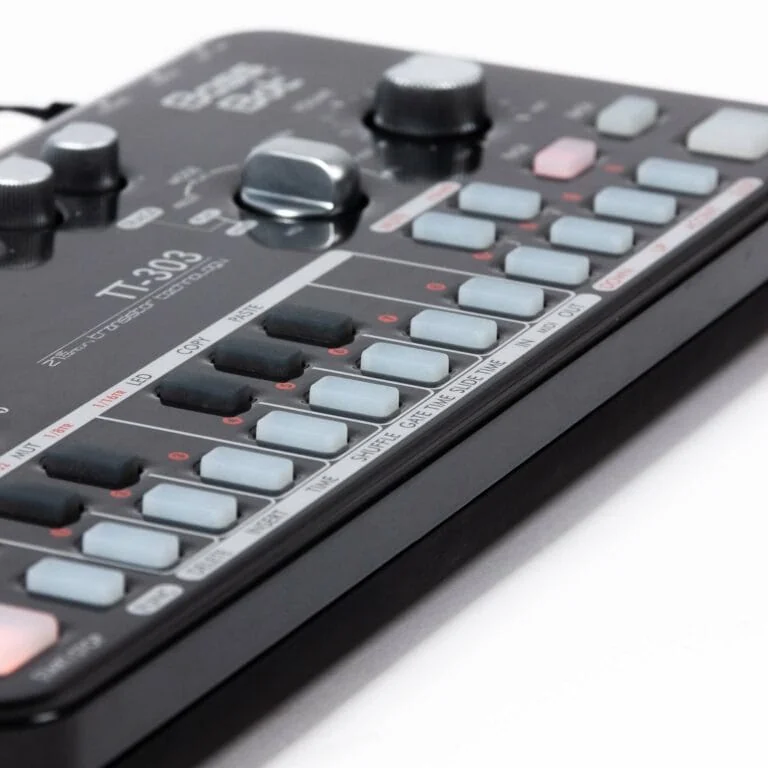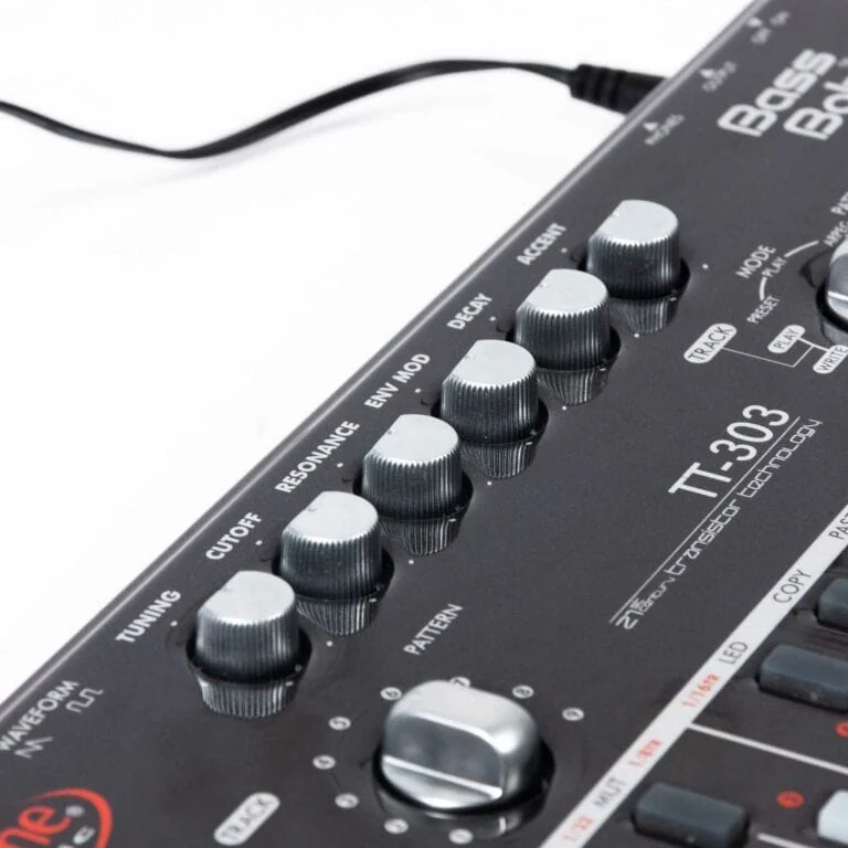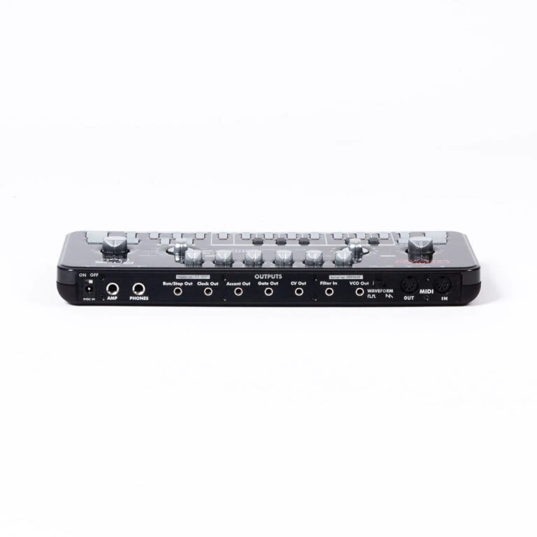 - Ausgänge: 1x Amp (6,3 mm Klinke), 1x Phones (6,3 mm Klinke), 1x Run/Stop Out (3,5 mm Klinke), 1x Clock Out (3,5 mm Klinke), 1x Accent Out (3,5 mm Klinke), 1x Gate Out (3,5 mm Klinke), 1x CV Out (3,5 mm Klinke), 1x VCO Out (3,5 mm Klinke), 1x MIDI Out (DIN 5-Pol)