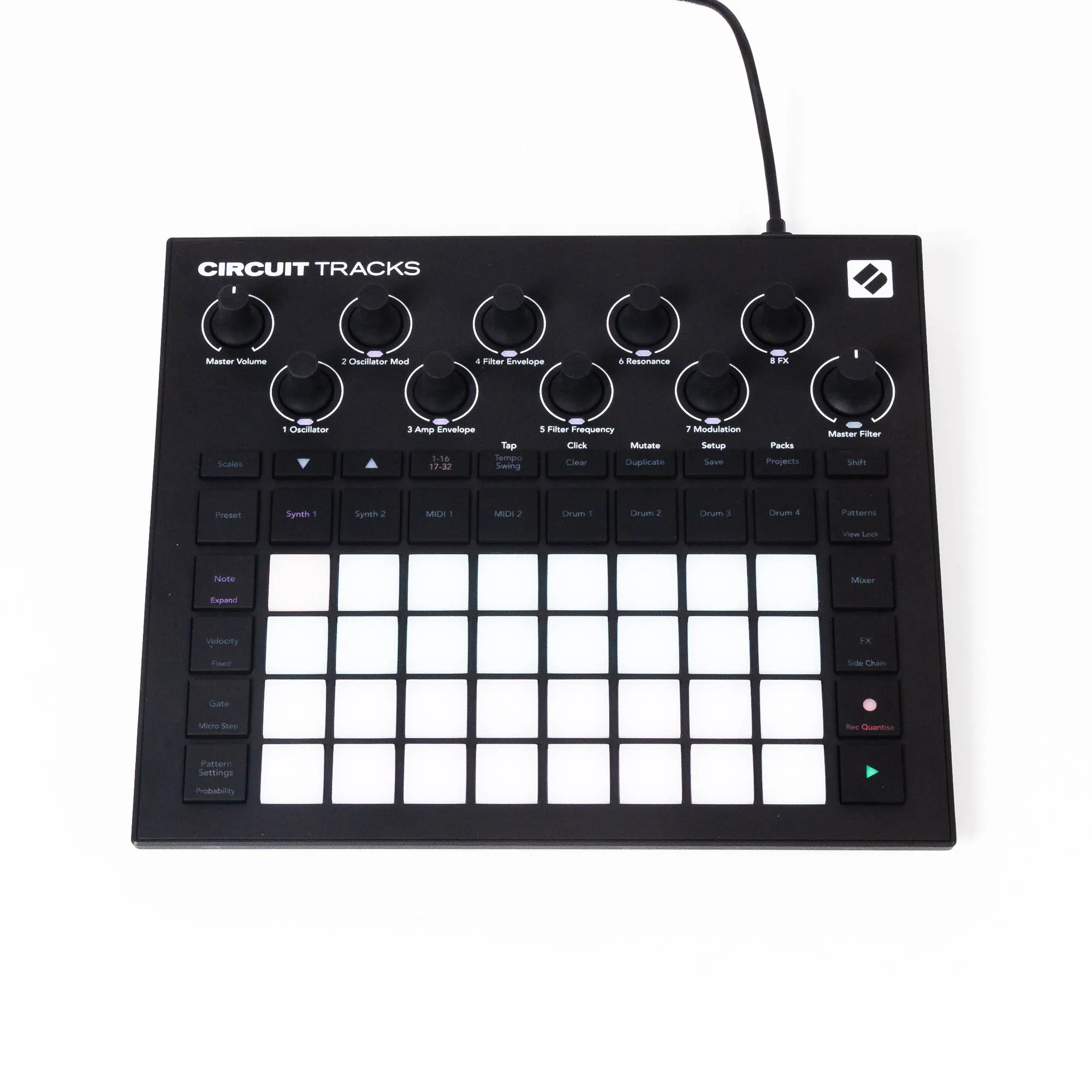 Die Novation Circuit Tracks ist eine innovative Groovebox mit einer ausgesprochen intuitiven Bedienung. Obwohl es auf ein Display verzichtet, lassen sich die zwei verbauten Synthesizer und vier Drumspuren kontrolliert bedienen und jeweils anhand von sechs Drehreglern modulieren. Ăber zwei MIDI-Spuren lassen sich externe Synthesizer ansteuern. Ein Step-Sequencer mit 32 Steps lĂ€sst sich ĂŒber die Velocity-sensitiven RGB-Pads ansteuern und jede Spur exakt programmieren. Ein Master-Filter erlaubt dir live schnell zu agieren und eine groĂe Auswahl an Reverbs und Delays verleiht deiner Performance RĂ€umlichkeit und Dynamik. Wenn dir der interne Speicher nicht reicht kannst du diesen mit einer microSD-Karte erweitern. Dank seines kompakten und robusten Designs wird die Novation Circuit Tracks zu einer vielseitigen Groovebox fĂŒr Unterwegs, auf der BĂŒhne oder zu Hause.
